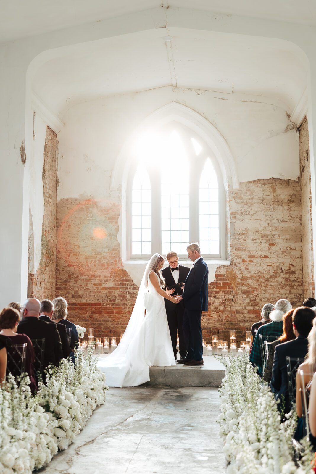 Wedding planner Angela DiVincenti Babin of Angela Marie Events set a sparkling scene amidst the rustic exposed brick and plaster of the old church. Babin placed rows of floating candles in varying sizes atop the bare concrete altar and filled the space with clear acrylic chairs for the 75 guests. The aisle was lined with low arrangements of white roses and delphiniums. A string quartet played as Lindsey entered the church wearing a gown from I Do Bridal Couture.
