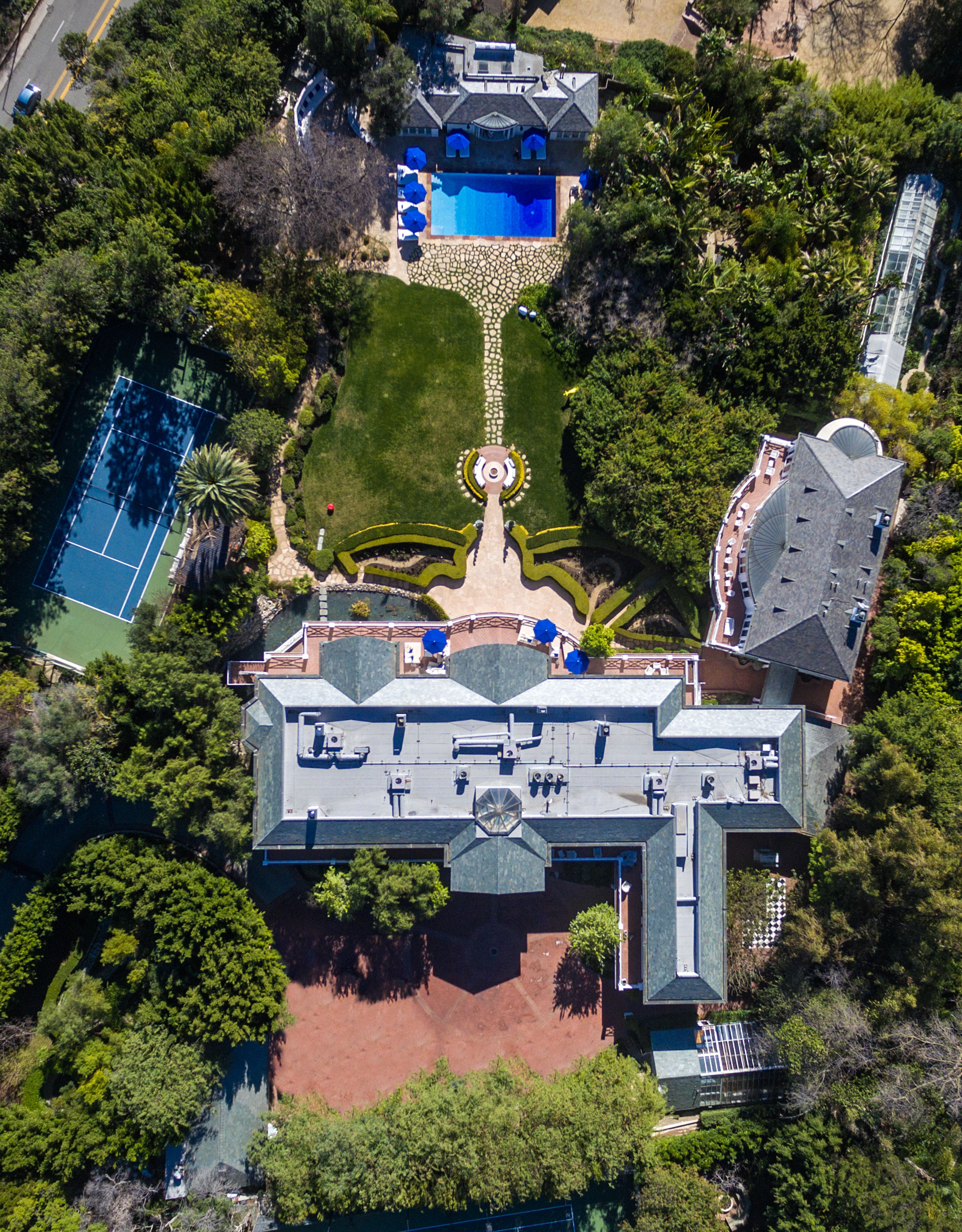 The Maison Du Soleil, a Holmby Hills mansion once owned by fashion designer Max Azria—whose influence still reigns in Hollywood in spite of his passing in 2019—is back on the market for a whopping $88 million. The architect Paul Revere Williams–lionized for projects like the Beverly Hills Hotel and residential designs for Golden Age luminaries like Lucille Ball and Frank Sinatra–designed the grandiose estate in the 1930s. With 30,000 square feet, this Sunset Boulevard home is never short of space, featuring 60 rooms plus a tennis court, a pool and pool house, a 6,000-square-foot movie theater, a fitness center and a bountiful supply of patio space in which to admire the gardens surrounding the estate.