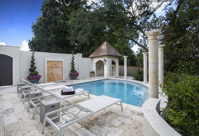 In designing the new pool area, Davis combined brick that complemented the home’s existing façade with Macedonia limestone for a look rich in dramatic texture. The curvaceous pool area was accented with columns echoing those on the rear of the home, and a small passageway house was set at the top of a stairway down to lake level.