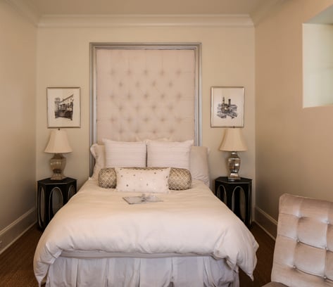 When the kids are home and visiting with their friends, Dee and Steve can retreat to their master bedroom, which with its two sofas and two desks provides ample room for them—and another special family member—to work or relax. “Milo, our rescue dog, loves to sit in here with us,” Dee says. “He has taken over one of the sofas. But we love it in here—it’s our cozy family late-night den.”