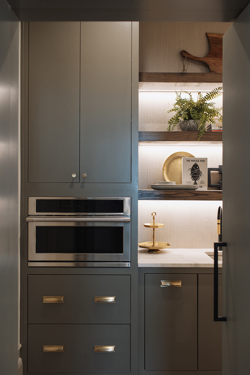 The dark stain of the kitchen island is carried into the butler’s pantry through floating shelves designed to store and showcase homeowners’ serving pieces. Plenty of storage and a sink make this space as functional as it is beautiful. The cabinets are painted Sherwin Williams’ “Solitary Slate.”