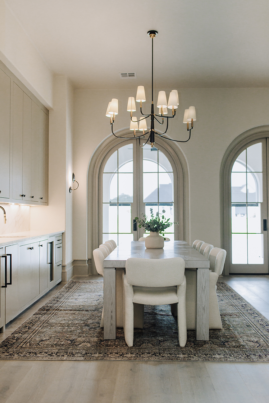 The dining space off of the kitchen is set off by an Oriental rug from Haghighi’s Persian Rug Gallery. “I think it adds the warmth the space needs,” Hooper says. The traditional style of the rug is offset by a clean-lined dining table and white boucle dining chairs from Inspirations Furniture & Design.