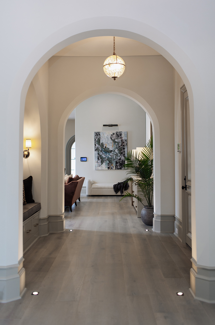 In-floor lighting was incorporated to showcase the statement arches that greet guests upon entry to the home and lead them into the main living spaces.