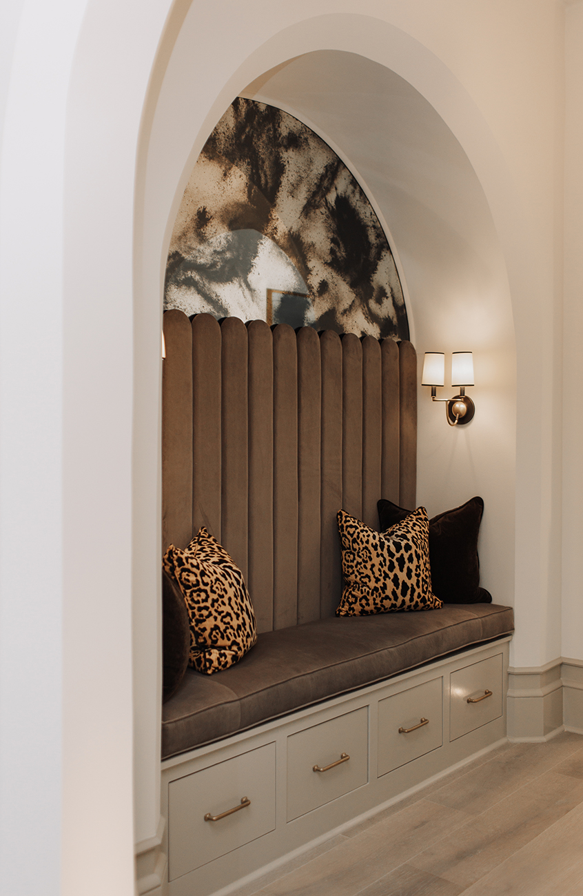 Originally designed as a mud-room-type space, Hooper reimagined this area in the foyer into a velvet-covered seating area she dubbed “The Grotto.” An antique mirror from M&M Glass reflects the light of sconces from Capital City Lighting, while drawers below allow the space to still complete its original function as a storage space for purses, shoes and more.