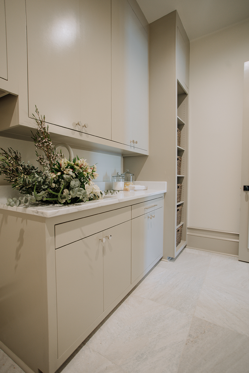 Natural shades also cover the cabinets in the laundry room. A large sink makes the space versatile for everything from dogs to flowers.