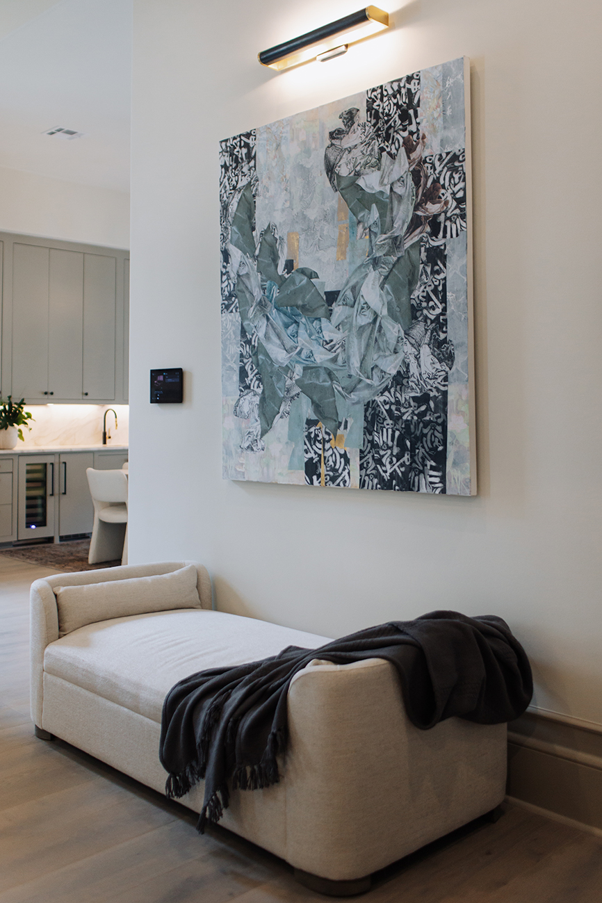 A cool-toned Demond Matsuo work from Ann Connelly Fine Art occupies a wall between the living room and kitchen spaces. An upholstered bench below makes the space functional, offering extra seating for the family and guests alike.