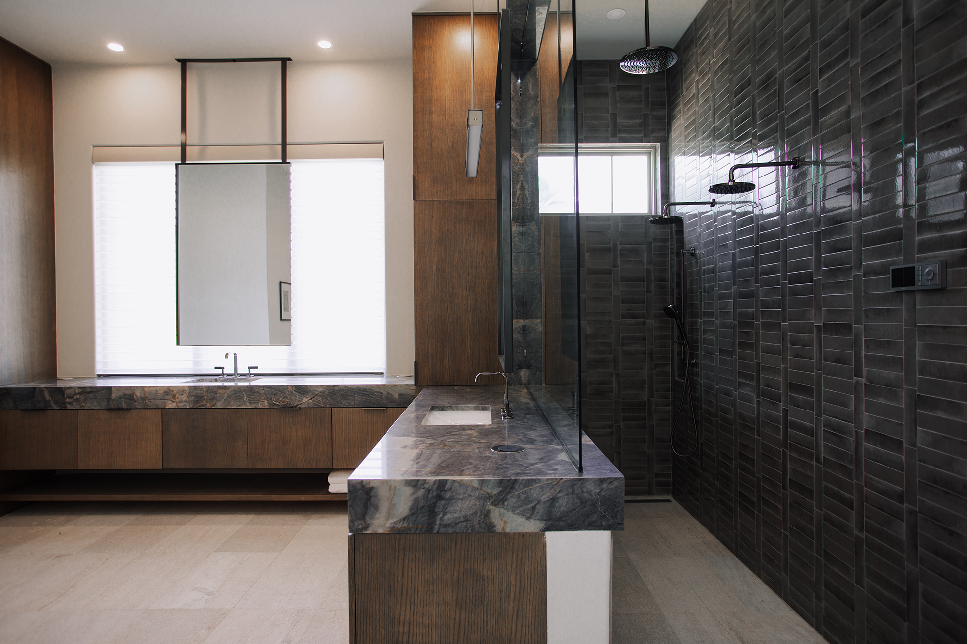 The primary bathroom is more than meets the eye. The bold, dark-toned quartzite that makes up the counters also flows seamlessly into the adjacent shower, providing a ledge for essentials like shampoo and soap. The two mirrors over the double sinks were hung from the ceiling in order to accommodate elements like a large window for natural light and a glass wall in the shower. “Because of this, we had to make sure the backs of the mirrors were just as beautiful as the fronts,” Hooper notes of the mirrors from M&M Glass Company.