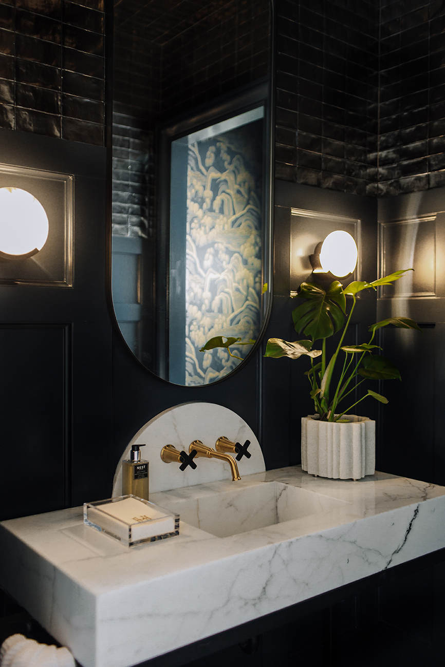 The gold-and-black wallpaper for the powder bathroom was an early find for Hooper. “I like a powder room to be moody,” she says. “Like a cave or a cocoon.” Black subway tile, an oval mirror and a marble vanity complete the space.