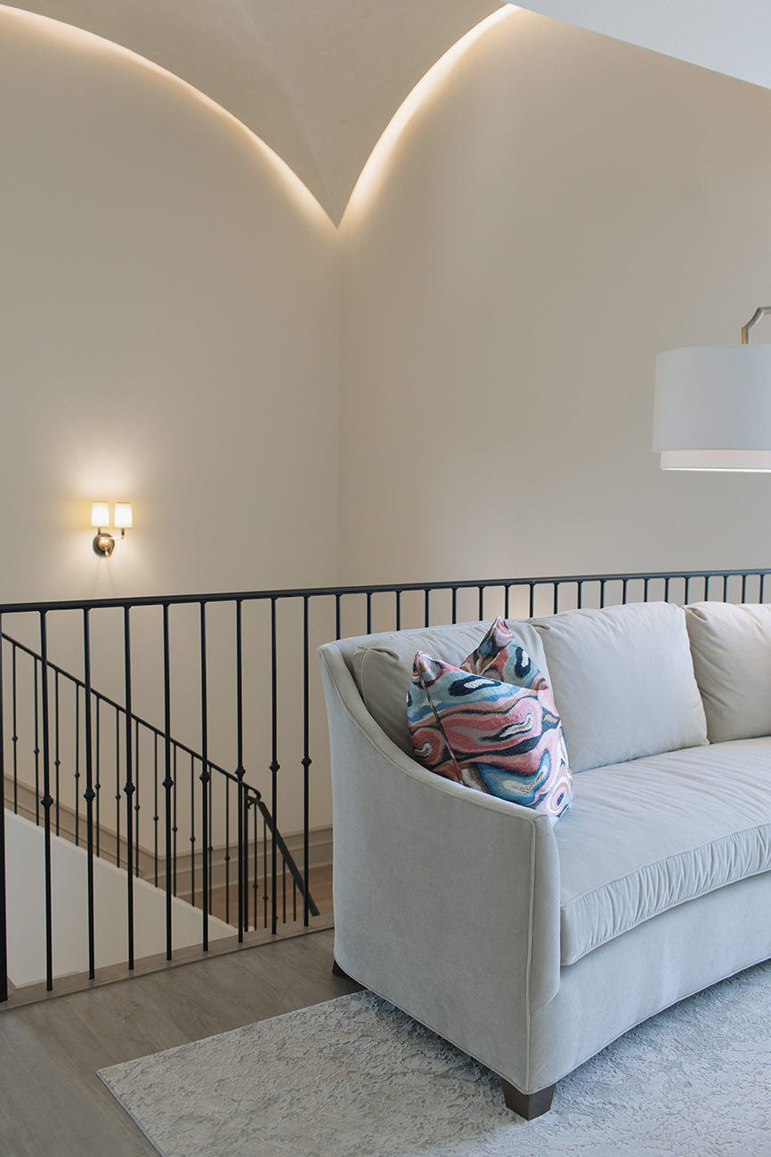 A suspended groin vault ceiling makes a statement above the home’s stairway. Ironwork by Josh Allemond with Superior Design & Fabrication flanks the stairs and adds contrast with the home’s light and bright wall color. The second story landing features a casual sitting area.