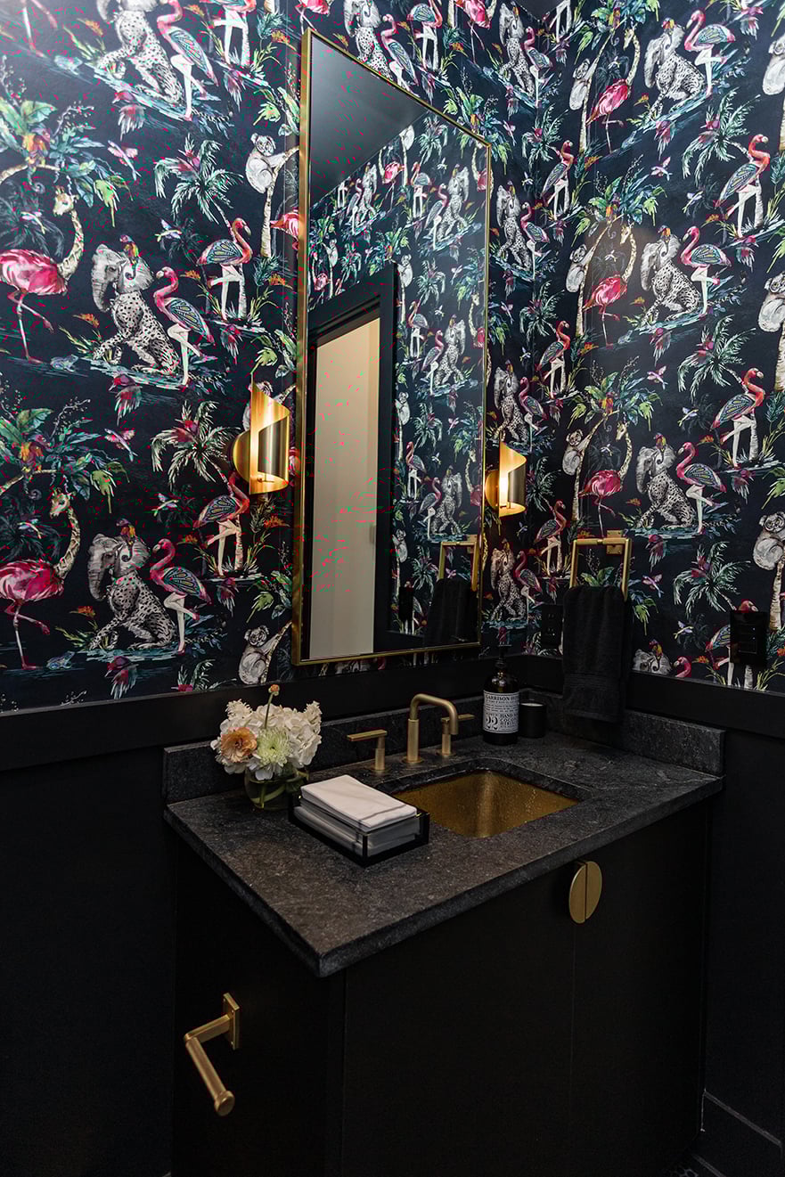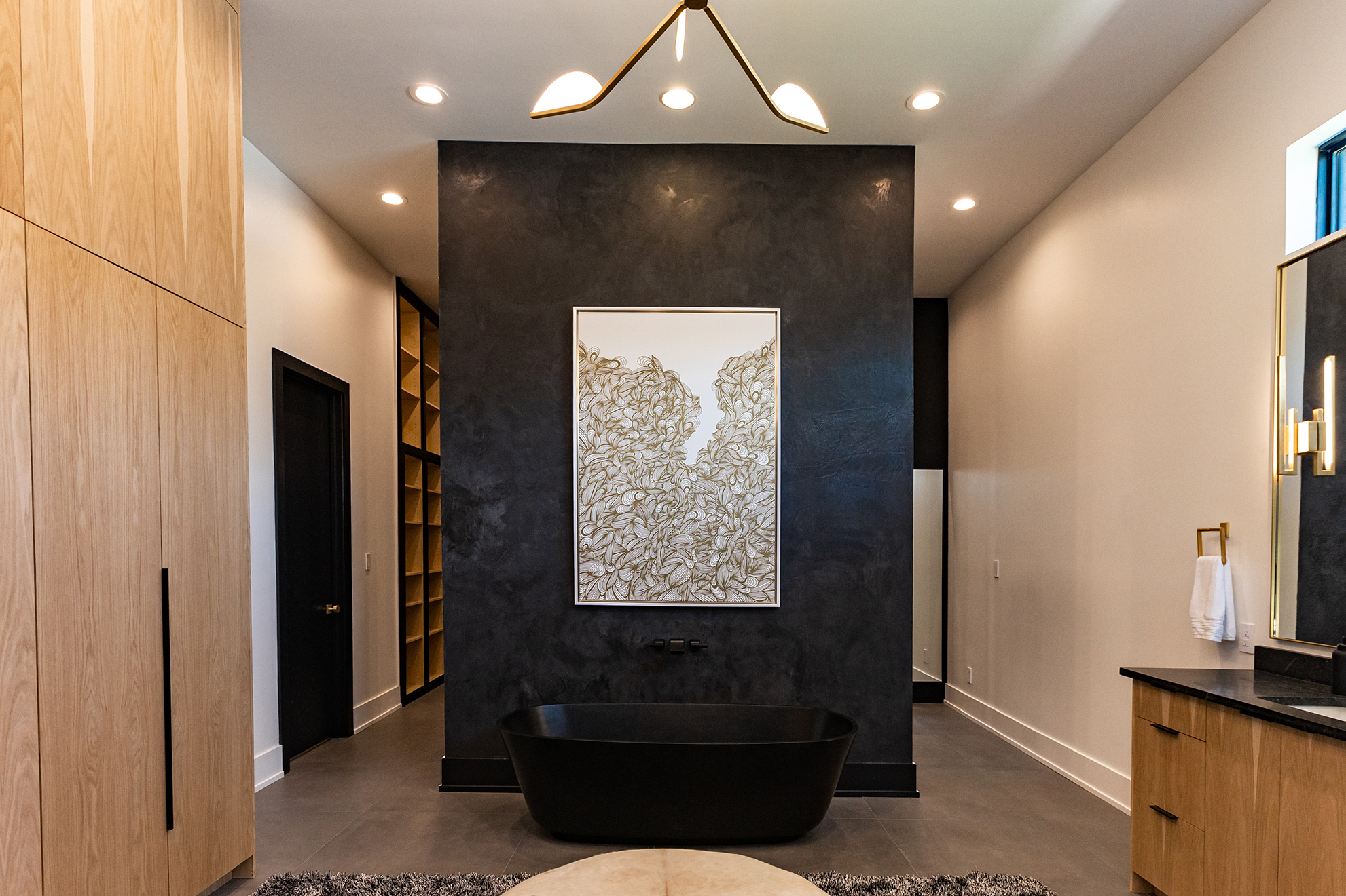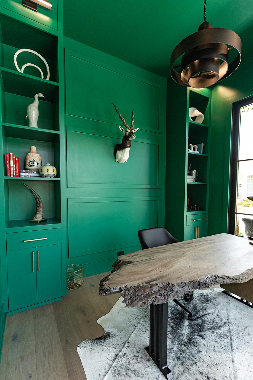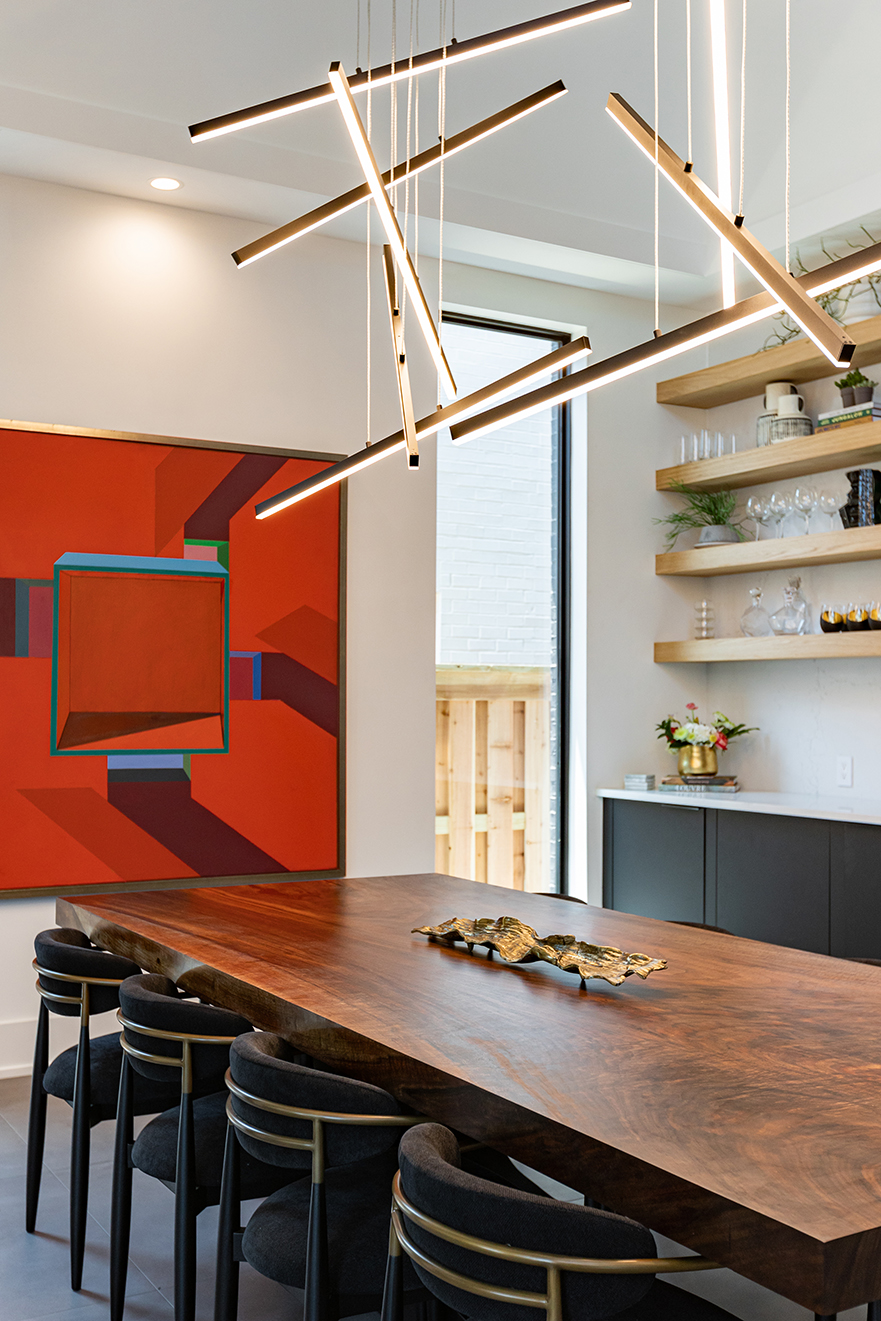 Once inside the front door, the drama steps up a notch further, thanks to a floating black brick wall conceptualized by Walker and two stag paintings by Demond Matsuo that give the first indication of the vital role art plays in this home. “It was really important to us to not just buy art to fill the house,” Ellen says. “We wanted to make sure that everything we got meant something to us and was something that we really loved.”