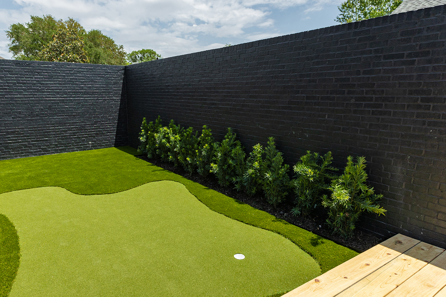 Against that dark backdrop out front, the landscape design includes an ivy-covered wire trellis and a steel water feature dotted with lilies in planters. “Usually, those are the kinds of details that people put in a backyard,” Shane says, “but we felt that curb appeal was such an important consideration here.”