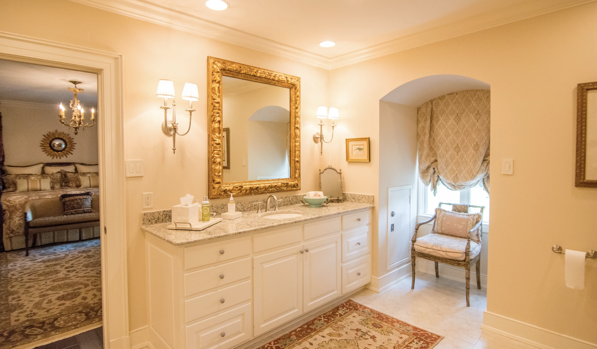“Take this opportunity to add another element of style to your space,” says Brown. “Add a chandelier to a sitting room with can lights. Forgo the typical vanity light in a bathroom and use wall sconces on each side of the mirror instead. Dress up the kitchen island with beautiful lanterns. Let the dining room chandelier act as a piece of art to balance the table, chairs and other case pieces.”