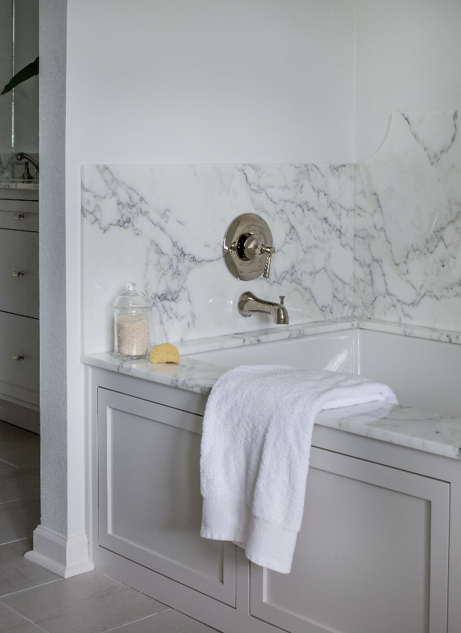 “When we’re designing a master bathroom, it’s important to find ways to create useful but beautiful niches that are both intentional and functional for the client,” she says. “I’m a fan of shallow upper cabinets in a bathroom, which we recess into the wall so that the space that is taken up on the countertop is minimal. Think medicine cabinet, but with a major upgrade.”