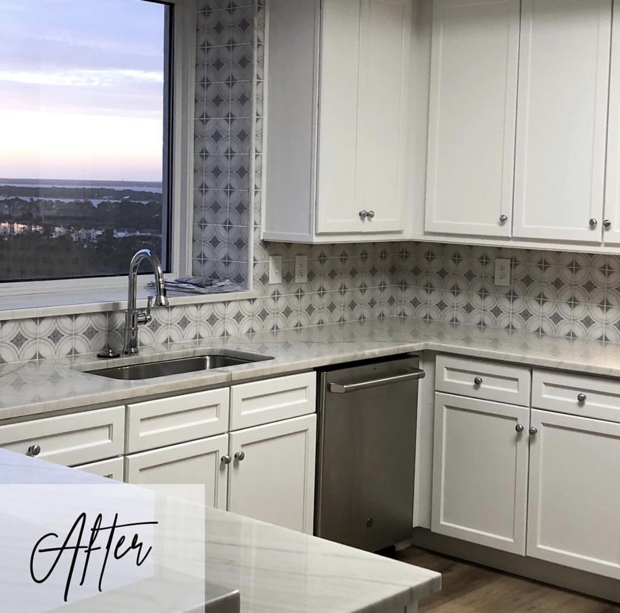 The first and most important step is to carefully select your finishes, since these small details become responsible for the new look of the space. In one of her recent kitchen renovations in Perdido Key Beach, Florida, Landry admits to falling in love with a handpainted marble backsplash tile. She then chose to build the rest of the room around it. “I selected a timeless and durable quartzite countertop, updated fixtures and appliances, and found the perfect shade of white for the dark existing cabinetry,” she says.