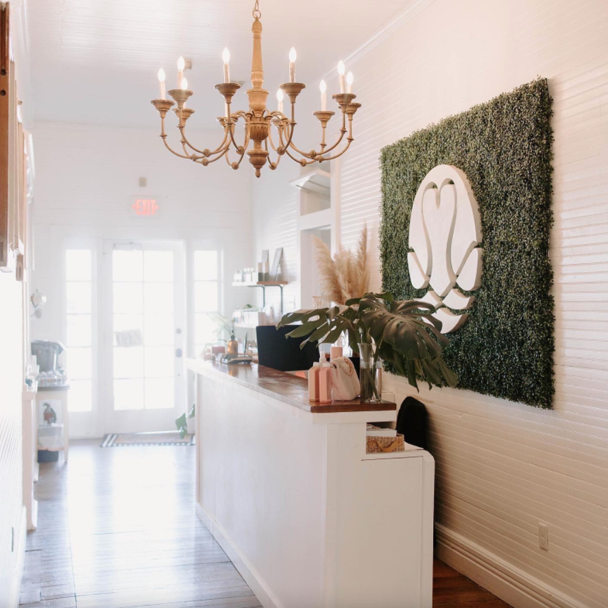 Another great way to add character to a space is through the use of an accent wall. If you’re going for a more rustic style for your space, a wood wall might do the trick. For the salon, Thrower kept a few of the wood walls from the original house because she wanted to keep the personality. “We left one wall in each room with its naturally distressed wood shiplap to act as an accent wall, and also kept it on top of the fireplaces. It gave the room some warmth,” says Thrower.