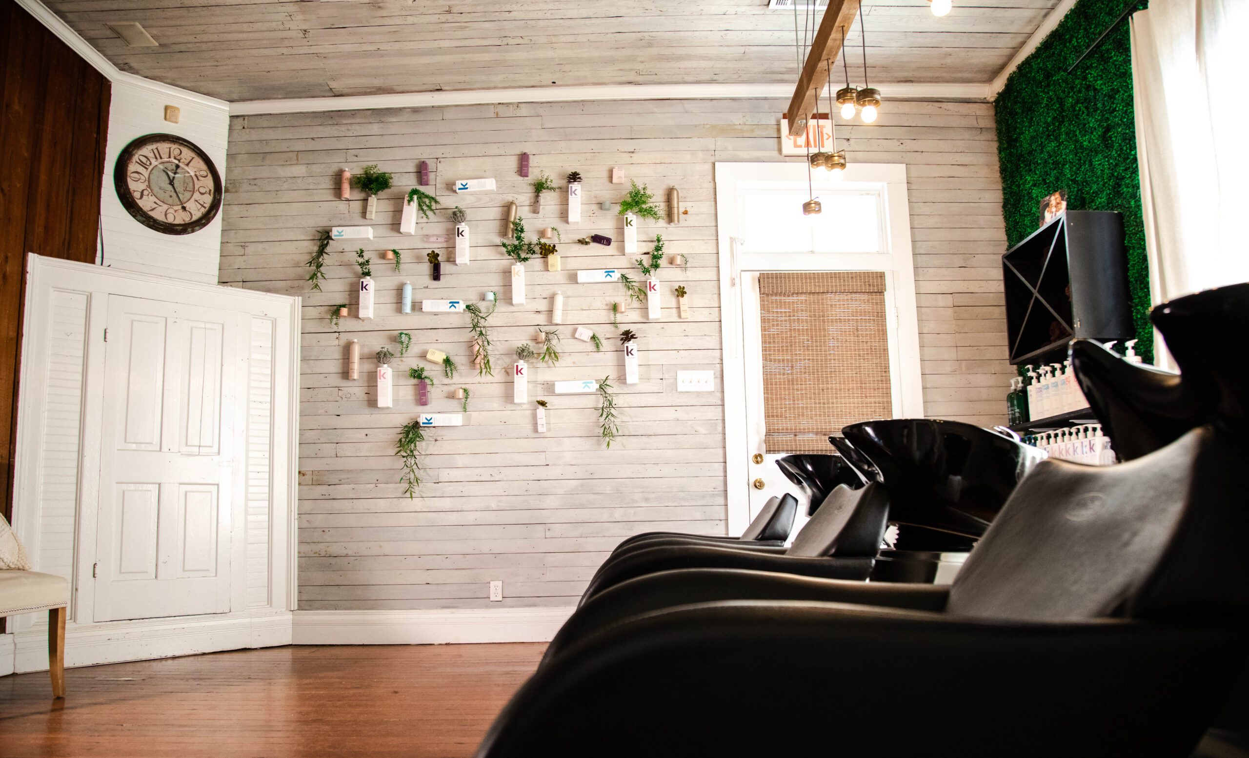 One of the first things you notice when you’re facing the salon is the light blue porch. Thrower wanted to keep the original plantation style alive. “Back in the day, they would color the porch light blue to cool it down from the heat; I didn’t want to take the history away from the home,” she says. It’s also a great way to add a fun pop of color in a place you least expect. A dark green encircles the front door and window frames, for example. The darker color contrasts with the porch and creates dimension and depth while keeping it from looking too flat.