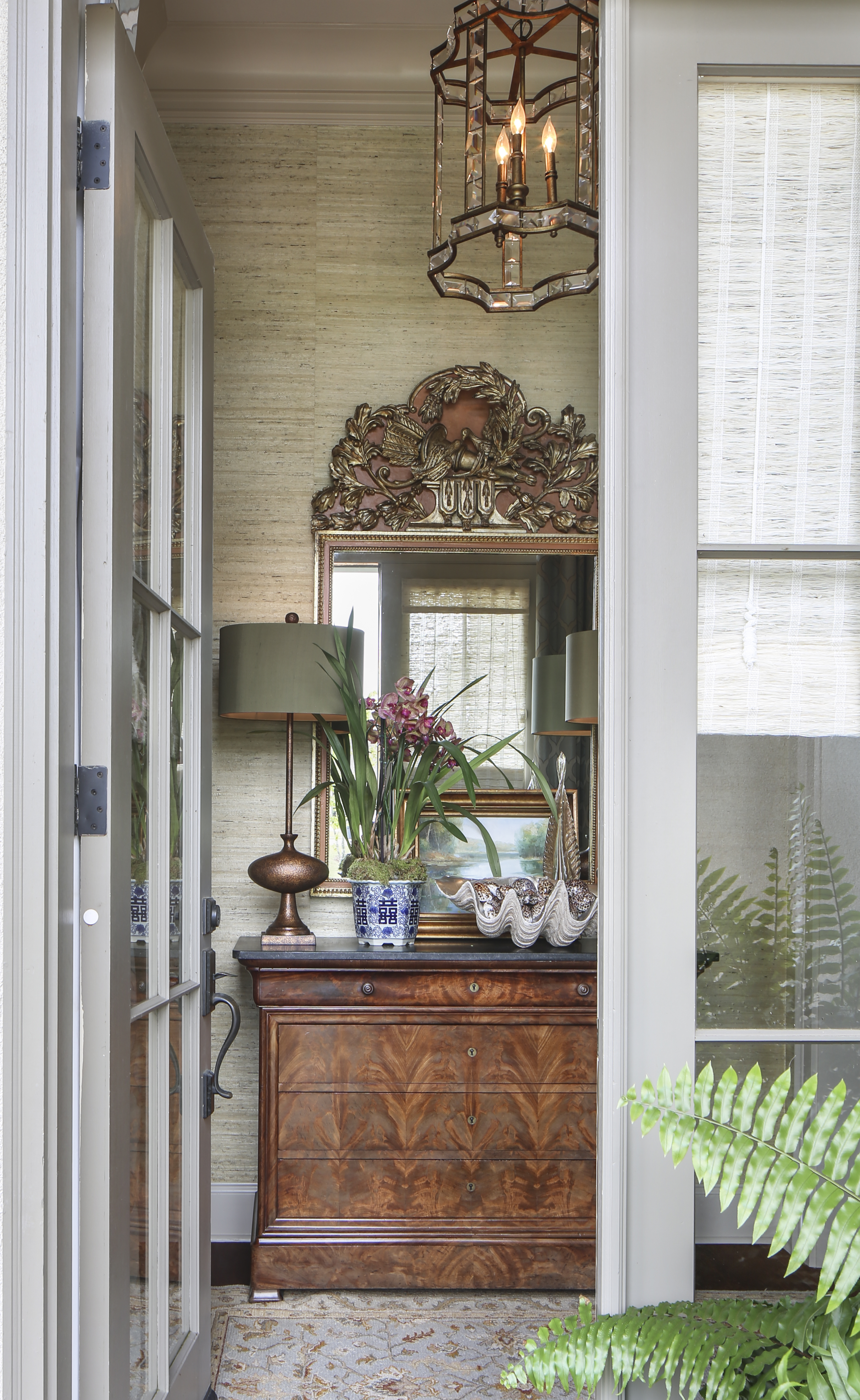 Nolan found another way to wow guests by incorporating wallpapers in strategic locations throughout the house. The formal foyer and the rear hallway wear grasscloth wallpapers, and the guest bathroom is adorned with an arabesque-patterned paper. One wall of the dining area is covered in a shimmering tone-on-tone damask-style Thibaut wallpaper. “I wanted it to be subtle, but just to visually push that wall back,” Nolan says. “At night, it’s really dramatic—the tones of the paper look like they’re reversed.”