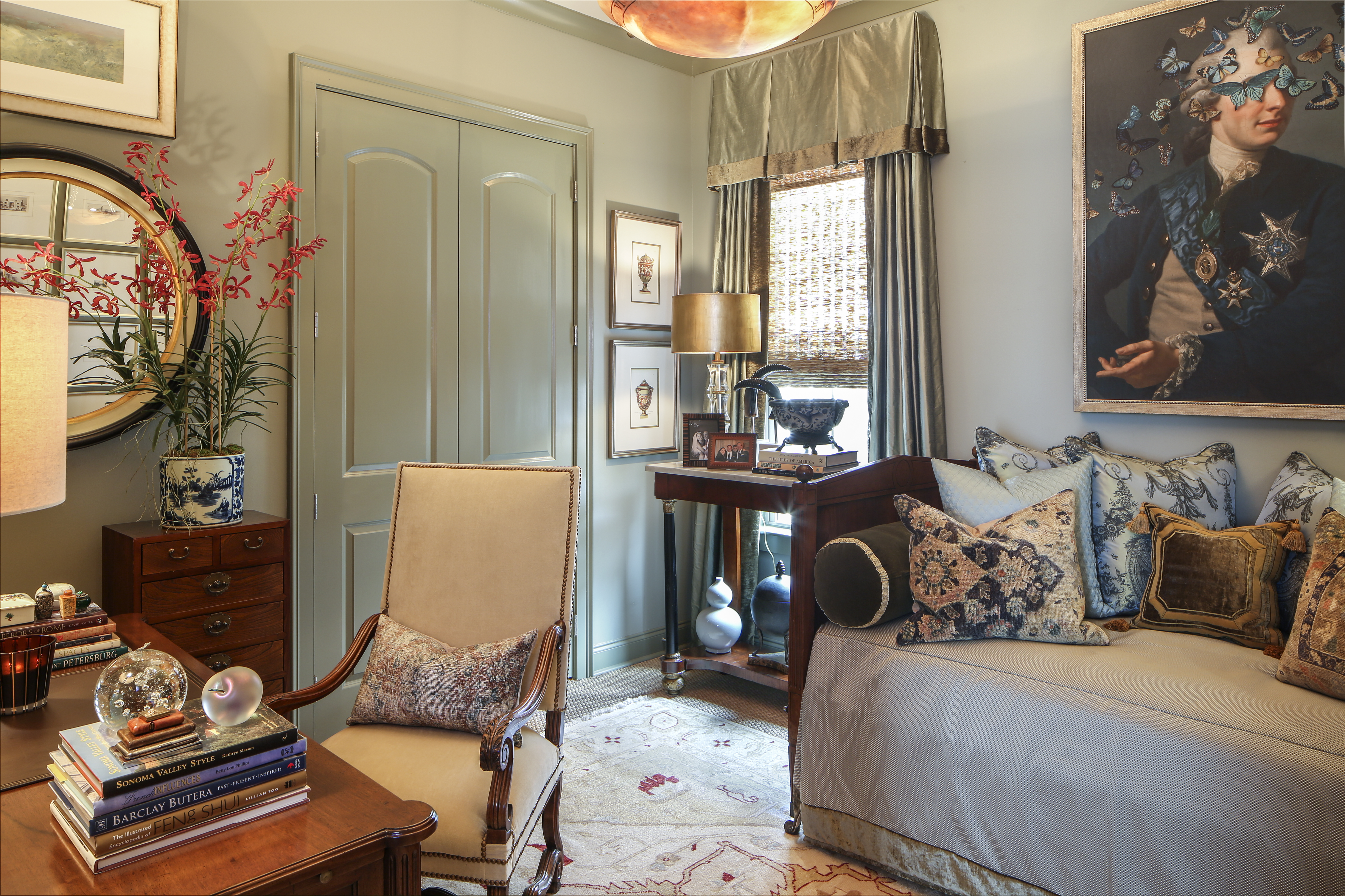 Outside of the public spaces, Nolan let his love for color dictate a cozy atmosphere in the home’s three bedrooms. A guestroom calms with deep brown walls that balance against wall-to-wall seagrass underfoot, while another bedroom, designed as a study with an antique daybed and desk, features sage walls that complement Nolan’s collection of Audubon prints. The master bedroom’s walls are painted in a dark tan hue, made all the more impactful by the presence of a curtained canopy that hangs down from crown molding all around the bed. An antique Italian screen on one wall and a Karastan cheetah-patterned carpet below complete the scene—one that can’t be confined to any particular time period but manages to feel of the moment.