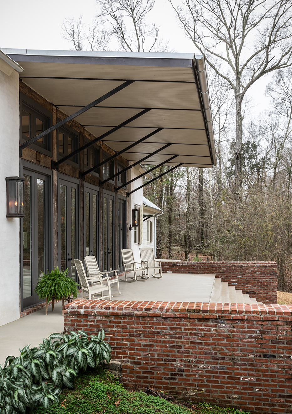For the rear elevation, Hance played off the structure’s connection to the lake, placing large swaths of ungridded windows and glass doors along the back of the living area to provide clear views of the water. Outside, he added a steel canopy to keep the sun from shining too brightly through those windows and to offer shade for porch sitters in the hot Southern summer.