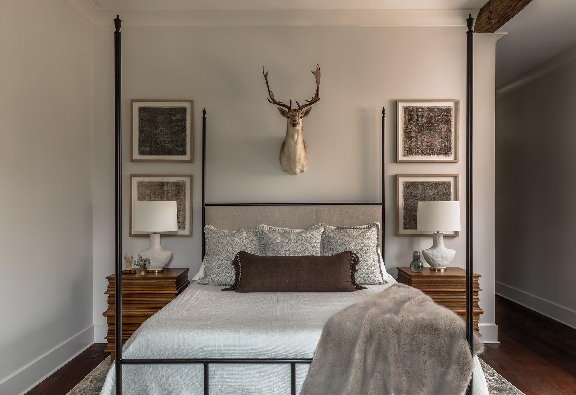 Another important design detail was provided directly by the homeowner: a taxidermy collection amassed over years of Brett’s hunting expeditions. An elk trophy now hangs above the fireplace in the living room, and a fallow deer holds pride of place in the primary bedroom, which was designed to look out directly over the lake.