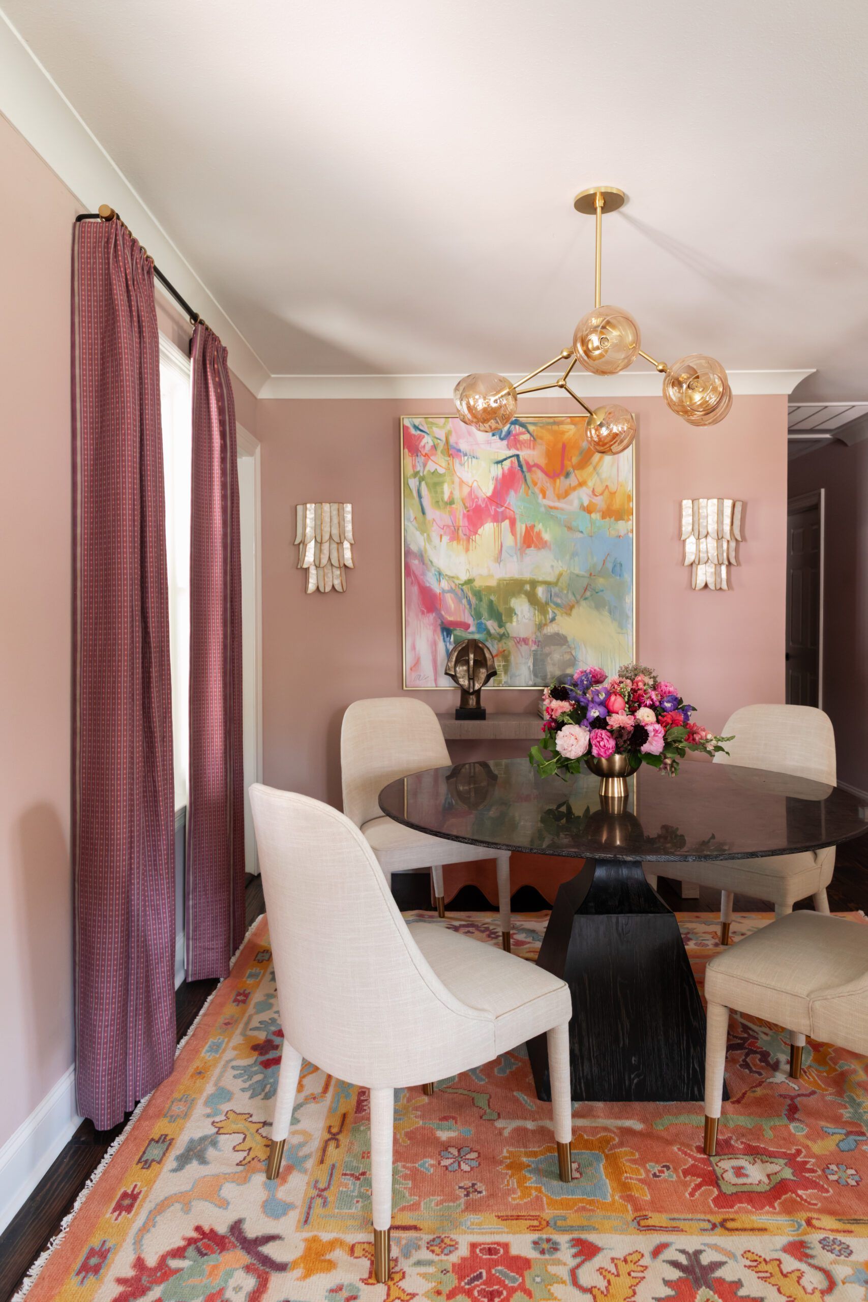 And push the envelope she did. Working from an “anchor” textile of a grasscloth mural wall covering that ended up gracing the walls of the primary bedroom, the color story unfolded in a bold way, with plenty of pinks and an array of jewel tones. However, the magic, Cannon says, lies in the details, not just the colors themselves. Set against a backdrop of pink walls, a quirky combination of pinks, greens, golds, a plum purple and more in the open-concept kitchen, living and dining spaces is made to feel luxe through depth of texture—think velvets, shining brass and even spots of leather.