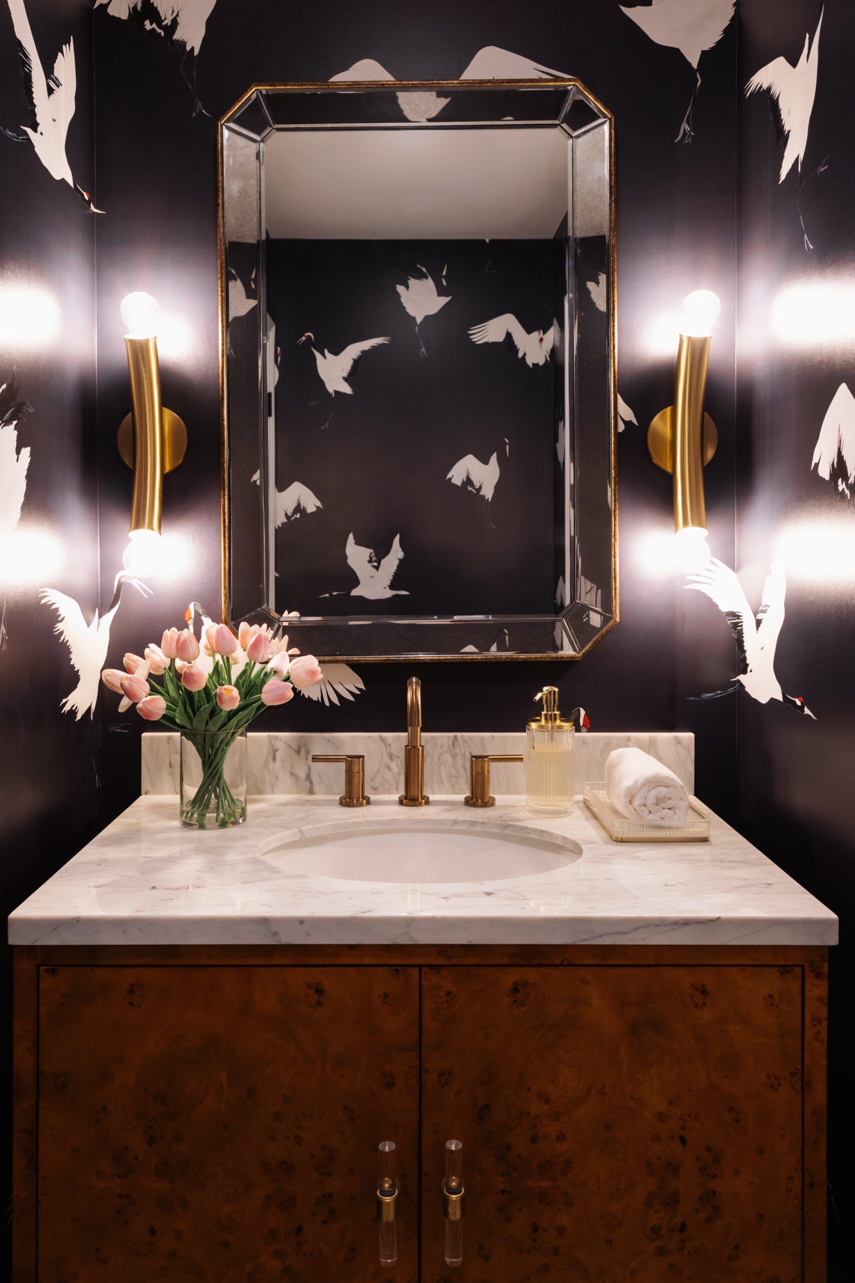 “I knew our client would want the most glamorous bathroom ever, so I pulled out all of the stops,” Cannon says of the primary bathroom. “We created a much more expansive bathroom, and I wanted jaws to drop when people saw it, so I went for it and made sure there was something interesting to look at everywhere you turn.”