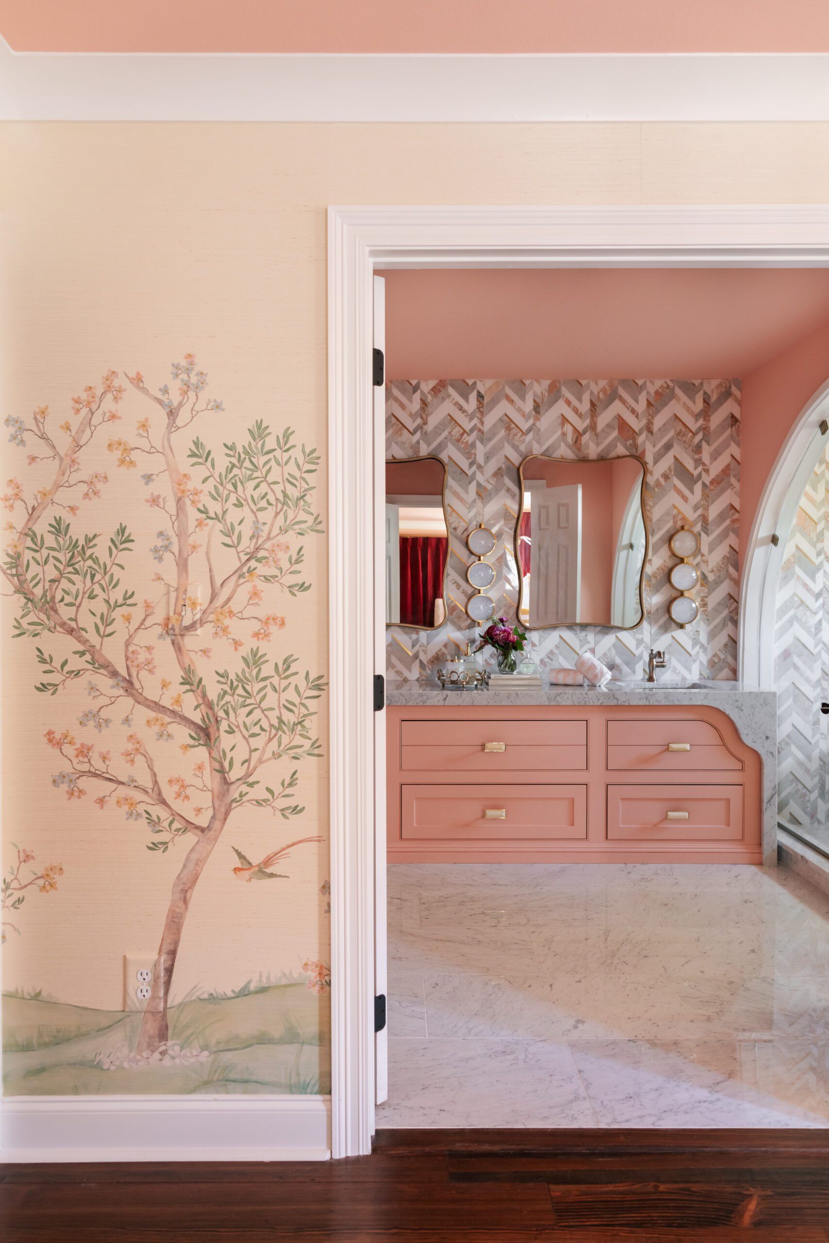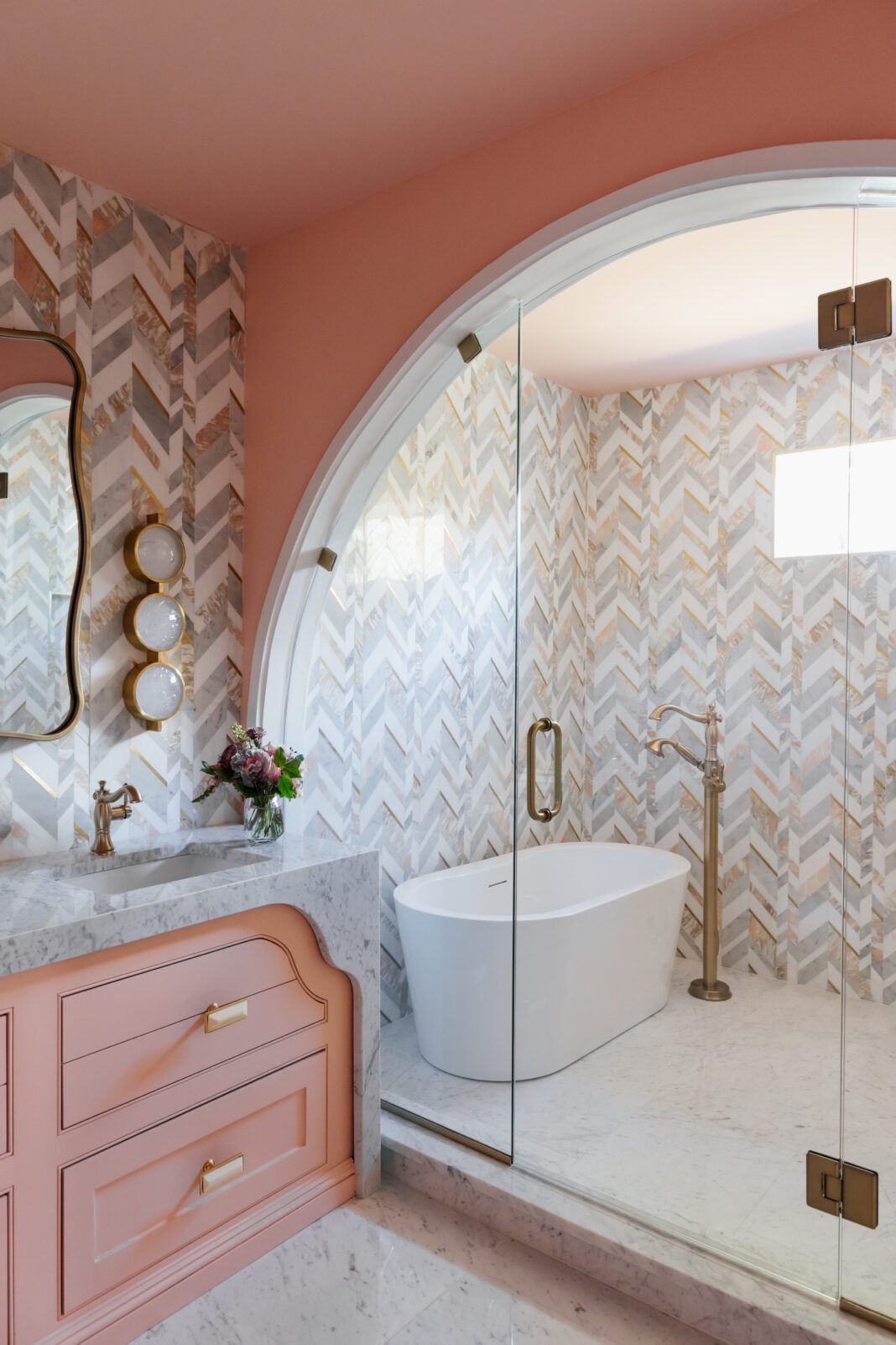 Yet another shade of pink washes the walls and cabinetry. A full tile backsplash on the vanity is carried through an archway and into a spacious wet room. A scalloped apron detail on the countertops, curvy mirrors and sconces reminiscent of bubbles or cocktail olives are the finishing touches. “Knowing that clients aren’t going to put creative handcuffs on you helps you to really tap into a place that leads to these kinds of results,” Cannon says.