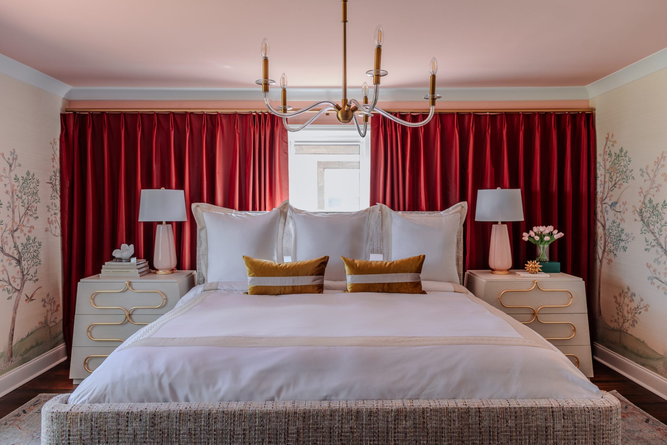 With a set of doors leading to the backyard added to one wall, the only location that made sense for the bed was in front of a window. Draping the entire wall in a deep red fabric was Cannon’s solution to ensure the arrangement didn’t look out of place. Upholstering the bed in a tweed textile reminiscent of a classic Chanel suit was a finishing touch that calls back to Carrie Bradshaw and adds yet another layer of rich texture.