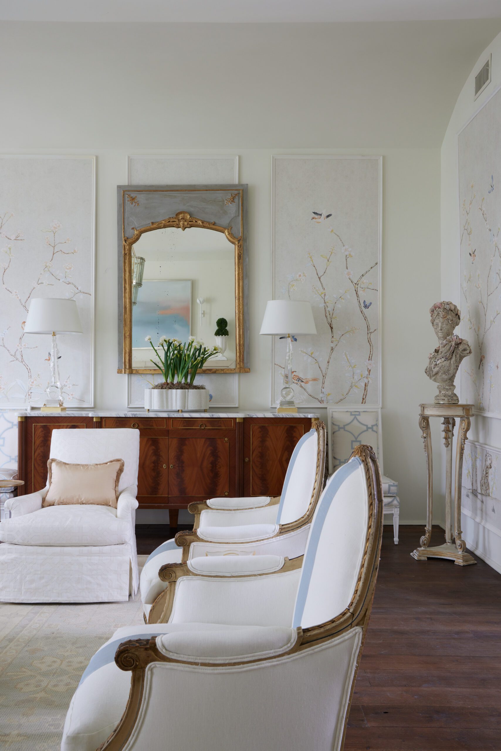 Starting from handpainted Chinoiserie mural panels that were applied throughout the space, Spencer brought in fabrics including custom silk and furniture styles that speak to a romantic and feminine version of elegance. However, the space is grounded with antique pieces like a one-of-a-kind Danish console that sits behind the sofa.
