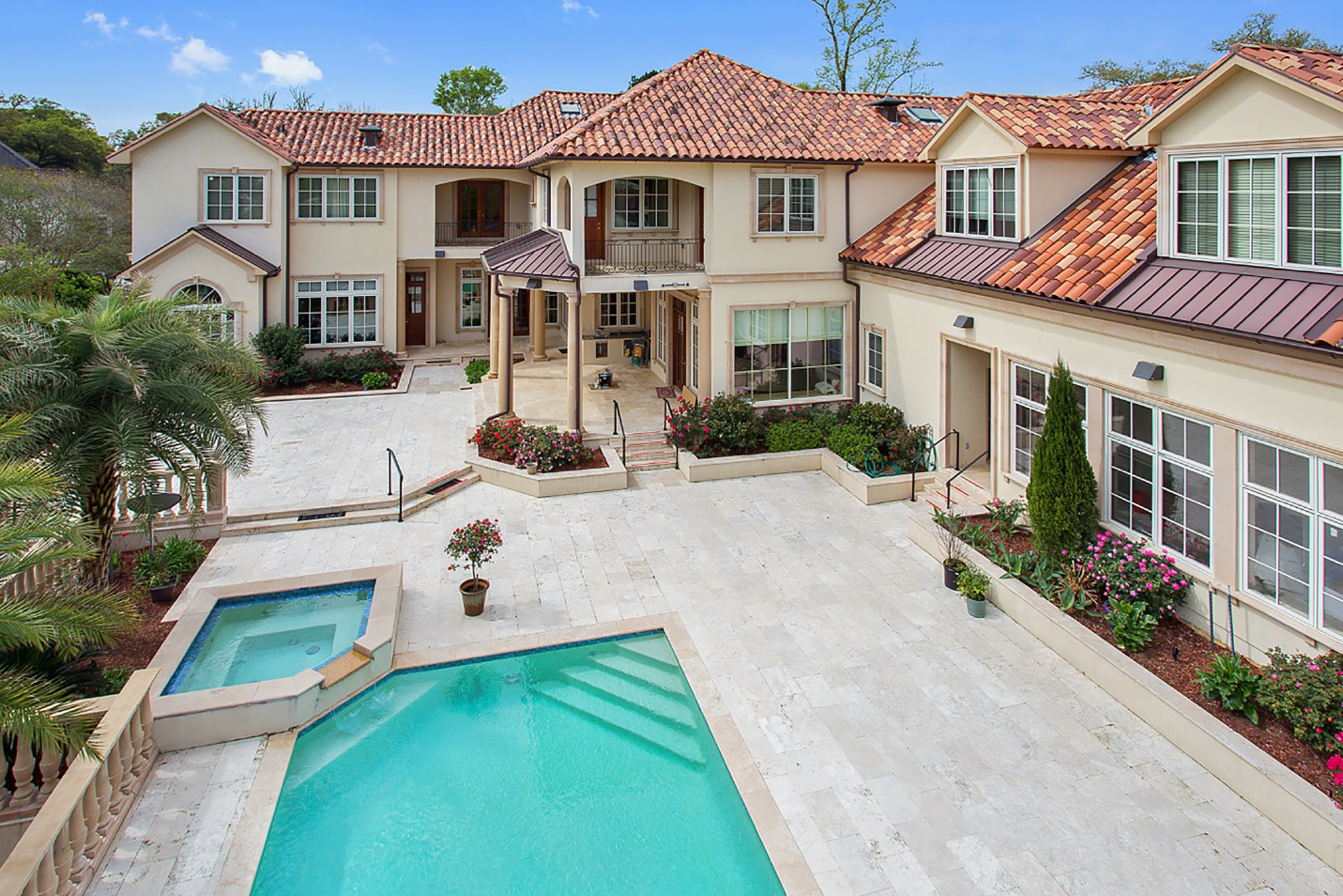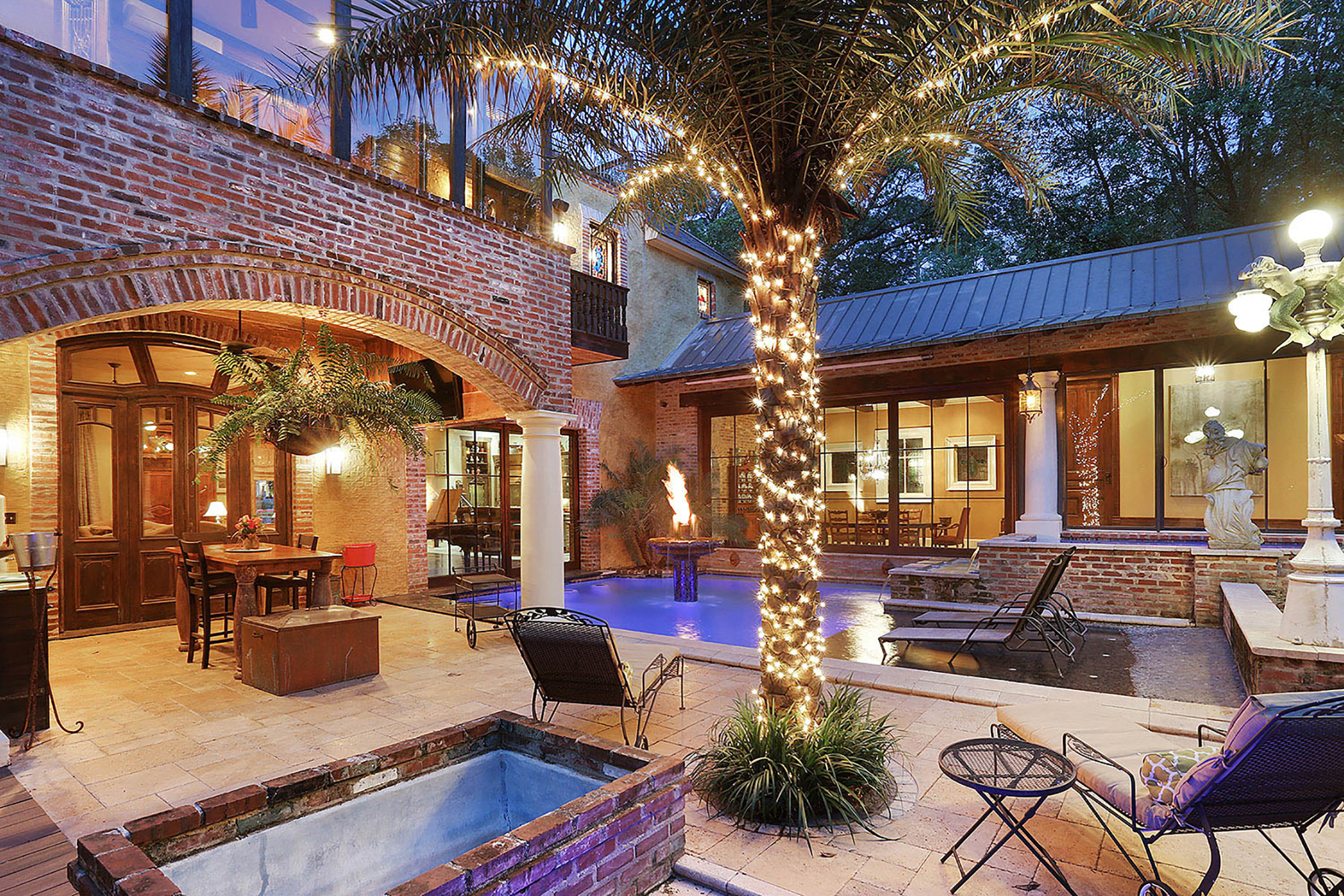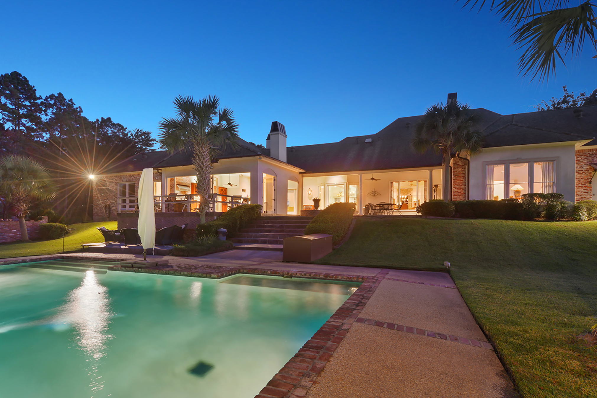 Lay of the Land: This house is situated on approximately three acres of land that extend to Bayou Manchac. The front entry steps are constructed of hand-shaped Texas limestone, as are the Doric columns. In the back, twin loggias and towers flank the pool, and one tower offers an elevator that leads to guest quarters. A substantial hot tub and outdoor kitchen complete the exterior living space.