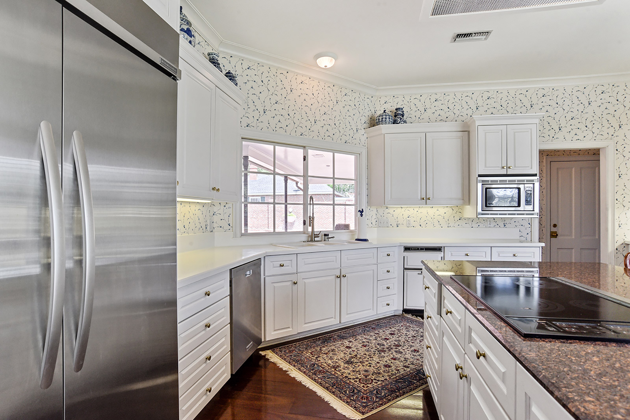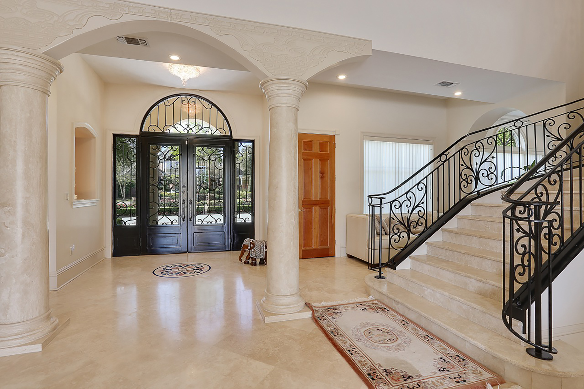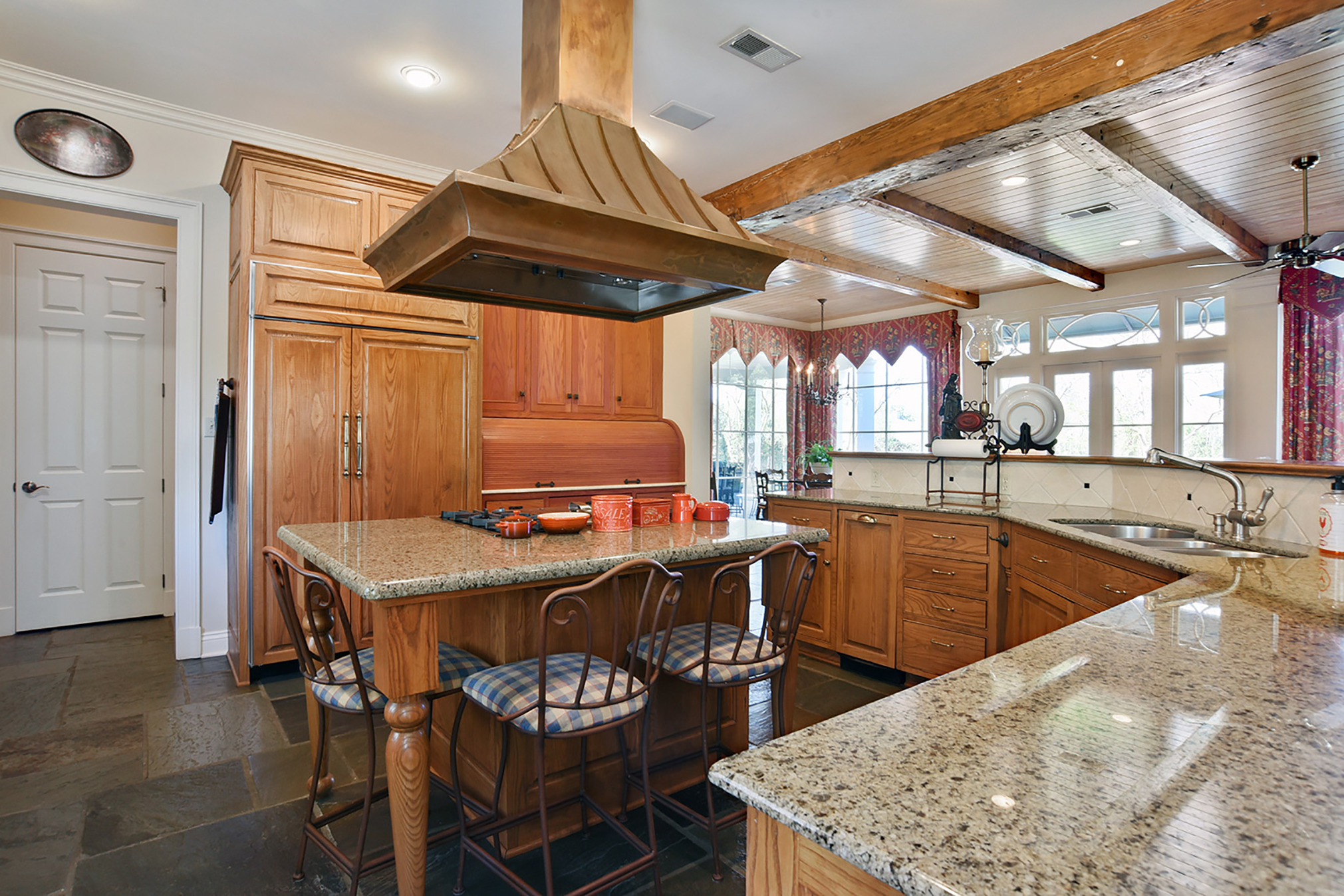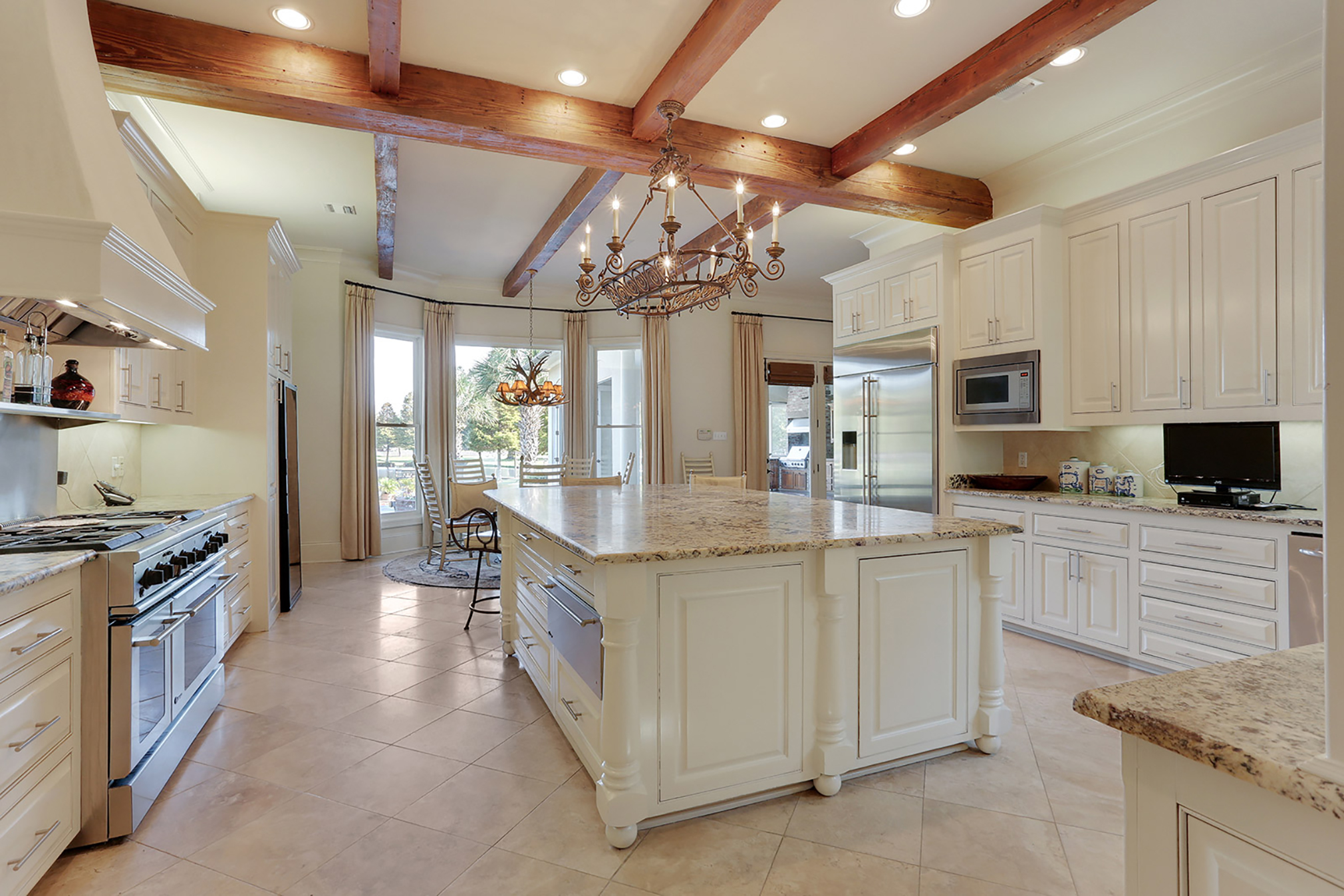 Within the Walls: The recently renovated kitchen—complete with Crema Marfil marble flooring, a six-burner stove, a copper sink, a wine cooler and stone countertops—is only one of the gems of this custom-built Highland Crossings private estate. It also offers a wine room, exercise room, his-and-her offices, media room and a master suite, with a private air-conditioned porch. These amenities are polished by red cypress doors, marble and wood floors, high ceilings featuring tongue-and-groove cypress and ceiling-high windows throughout the house.