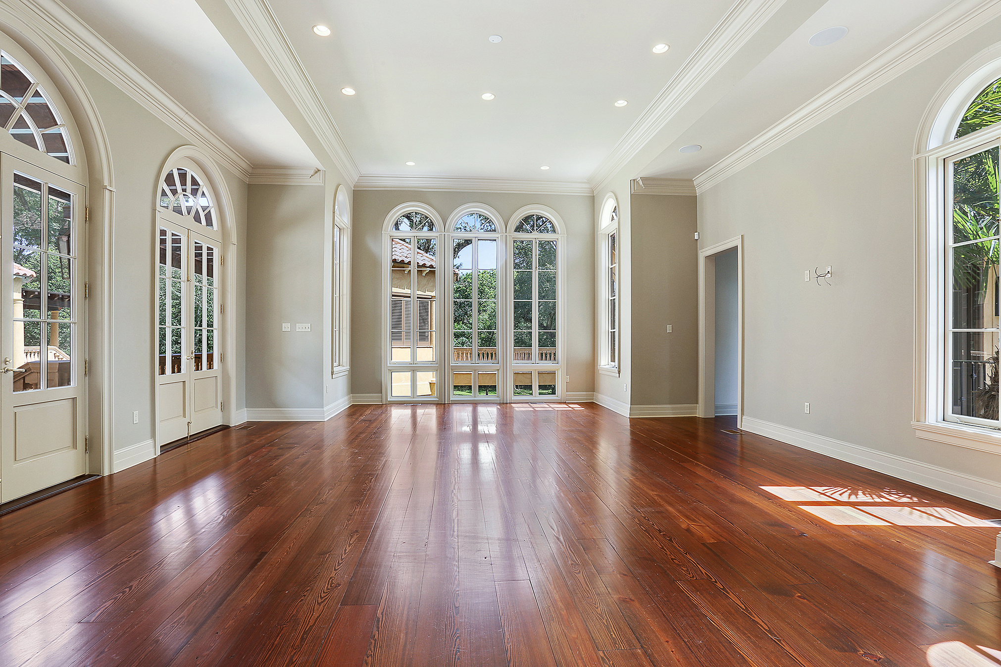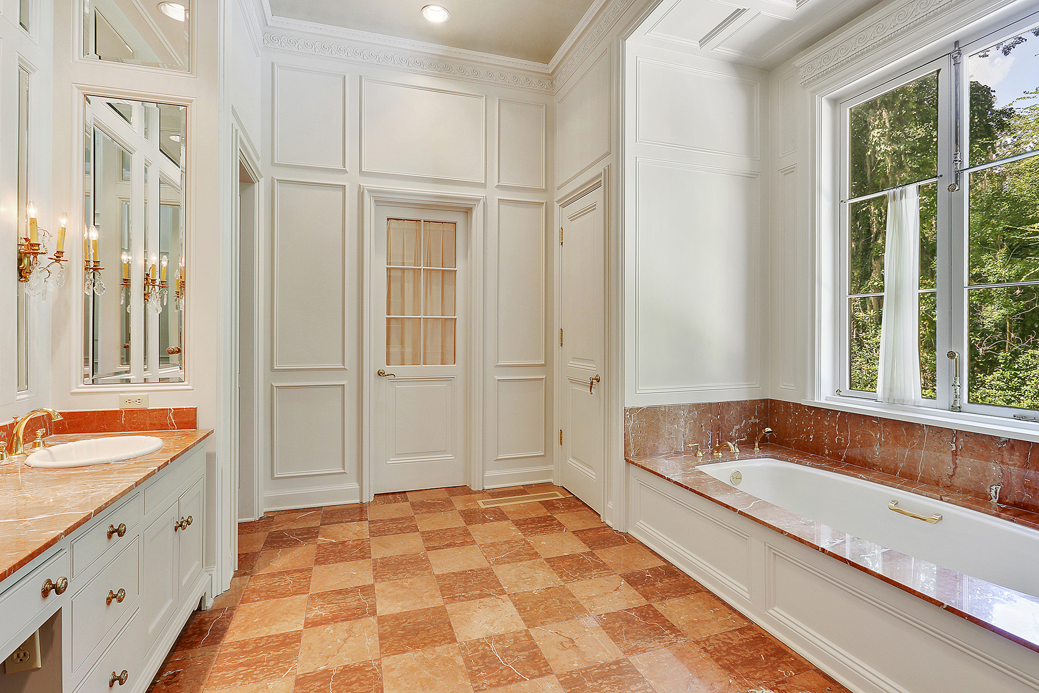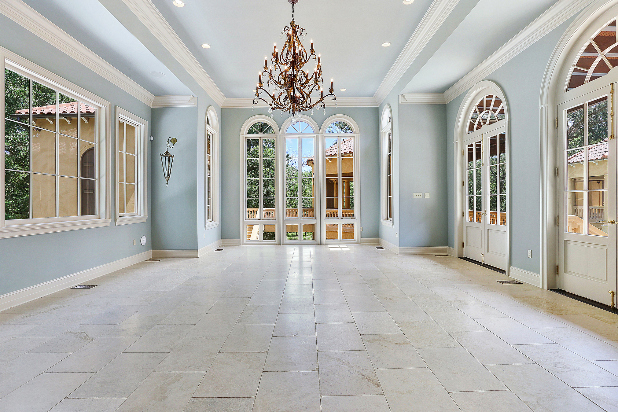 Within the Walls: This Palladian-style home in the Country Club of Louisiana combines architectural detail with grand scale. The living room boasts a Roman frieze and hand-cast-plaster coffered ceiling along with a custom fireplace mantel of hand-cut limestone. The dining room features antique mirror squares with leaded detailing. And the kitchen and breakfast wing has clay hexagon flooring, rustic iron stair railings and heavy beamed ceilings, much like a Tuscan farmhouse.