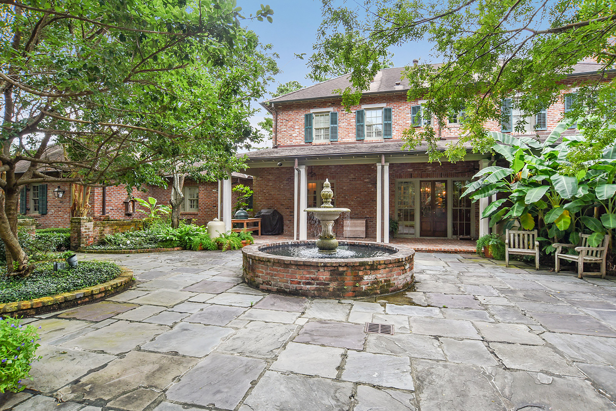 Lay of the Land: With approximately 1.75 acres in University Acres, this home offers copious space in the heart of the city. In the rear of the home is a veranda with a Pennsylvania blue flagstone courtyard featuring a large stone fountain. The Michael Hopping landscape design includes tree-lined brick walkways with boxwood and low brick walls.