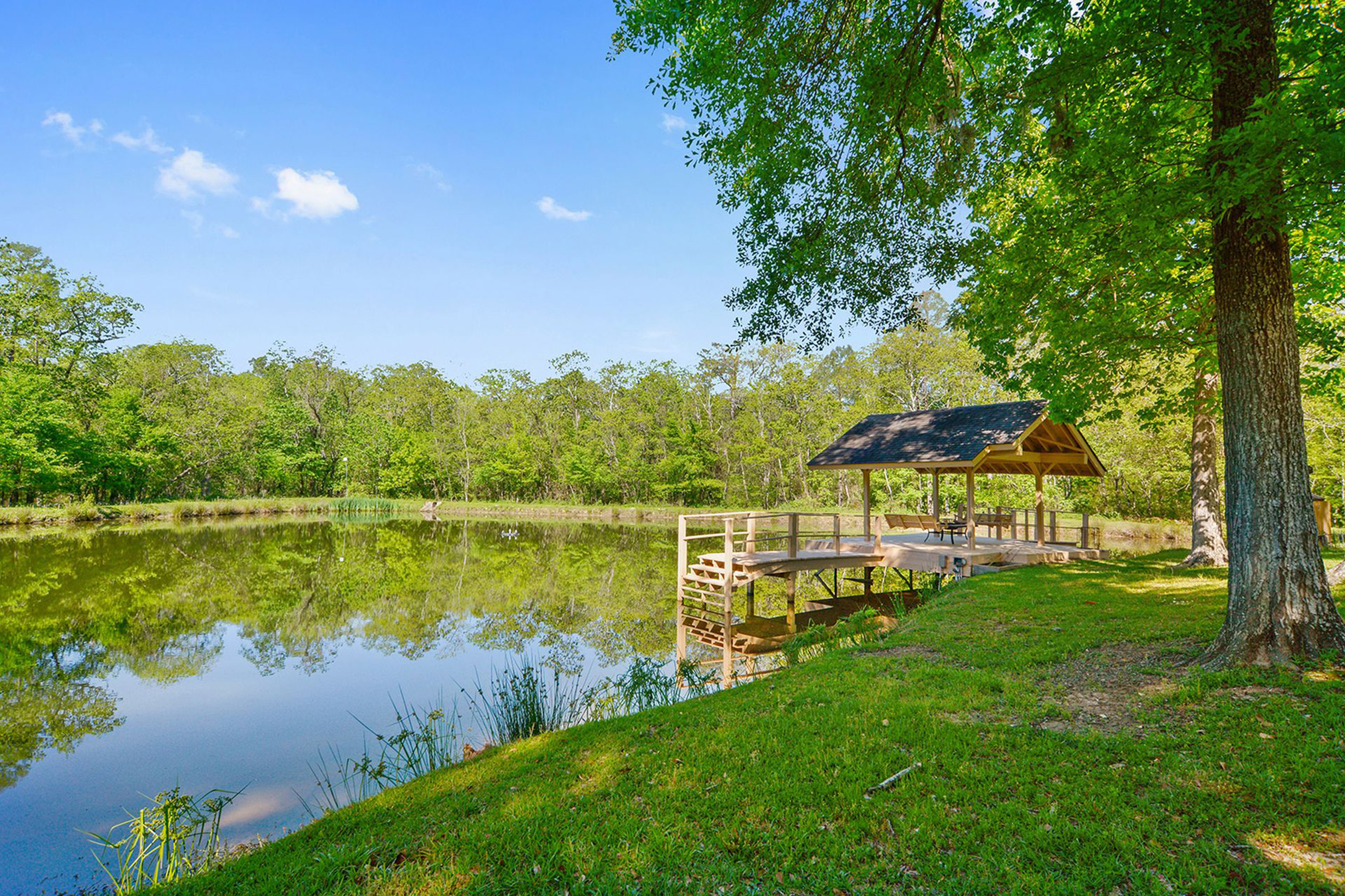 Lay of the Land: Five tree-covered acres offer plenty of privacy on this property. From the back porch, homeowners can enjoy views of the 1-acre pond. An outdoor kitchen with a swimming pool creates an atmosphere ideal for entertaining.