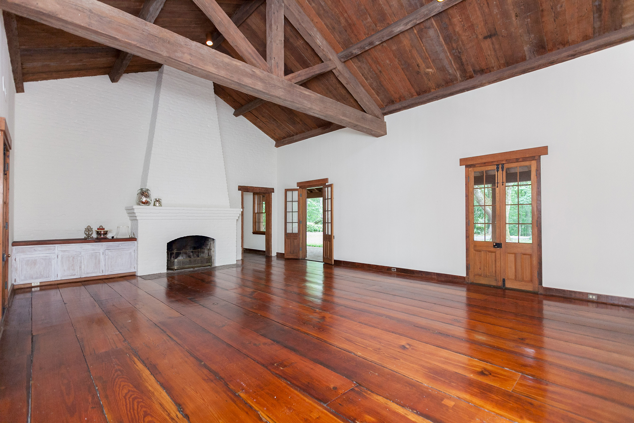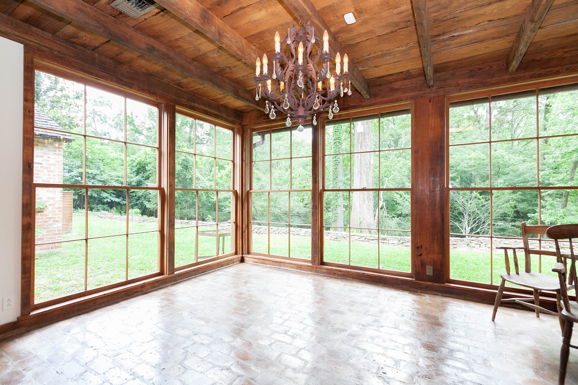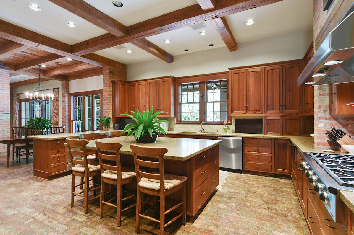 Within the Walls: This A. Hays Town home off Highland Road incorporates wood beams, floors, ceilings, doors, and millwork from an old French Quarter warehouse torn down over 50 years ago. The soaring ceilings, open floor plan and large windows blend the interior with views of the property’s woods from almost anywhere in the house. The kitchen features old cypress cabinets, island and ceilings, along with beautifully worn tan brick floors and a large walk-in pantry. Town designed an additional trophy room for the house, with a stone fireplace, cypress crossbeams and a cathedral ceiling.