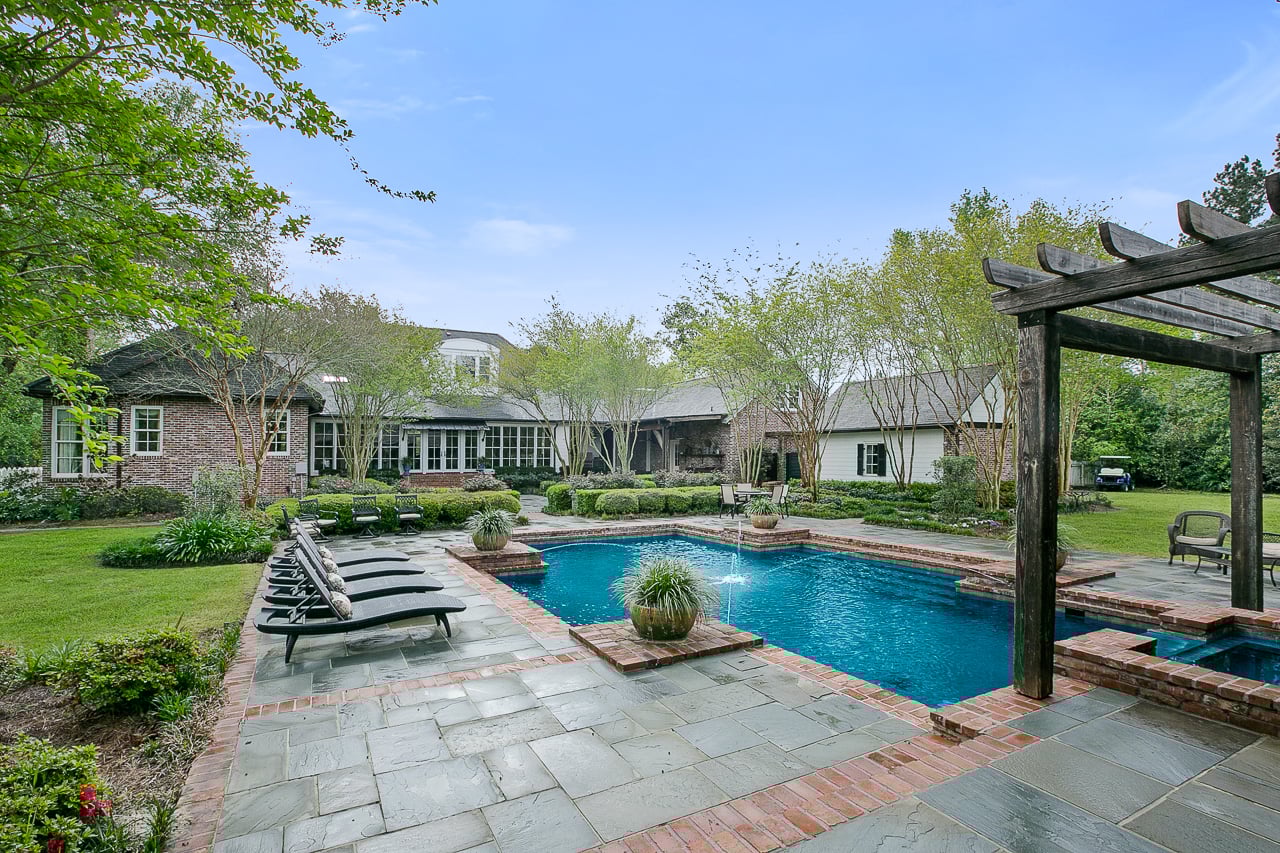 Lay of the Land: Fully gated and just over a mile from the Country Club of Louisiana, this home’s living spaces extend outdoors with a wraparound porch and brick-paved patios. A pool area is complete with a 1,008-square-foot cabana that includes an outdoor kitchen and dining area.