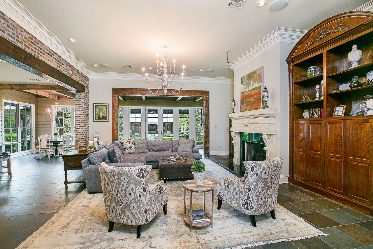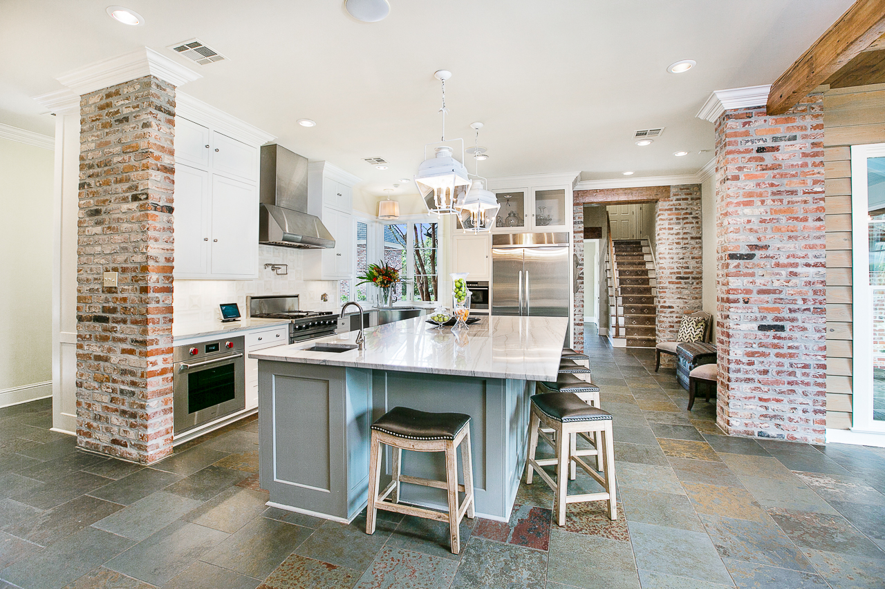 Within the Walls: Sitting atop 3.46 acres near Highland Road, this Acadian-style home’s light walls contrast with wood beams and exposed brick. A newly updated kitchen with quartzite counters, a Viking range and a Wolf oven leads into a large living room. The front dining room features an imported chandelier, while the master suite is located on the same lower floor.