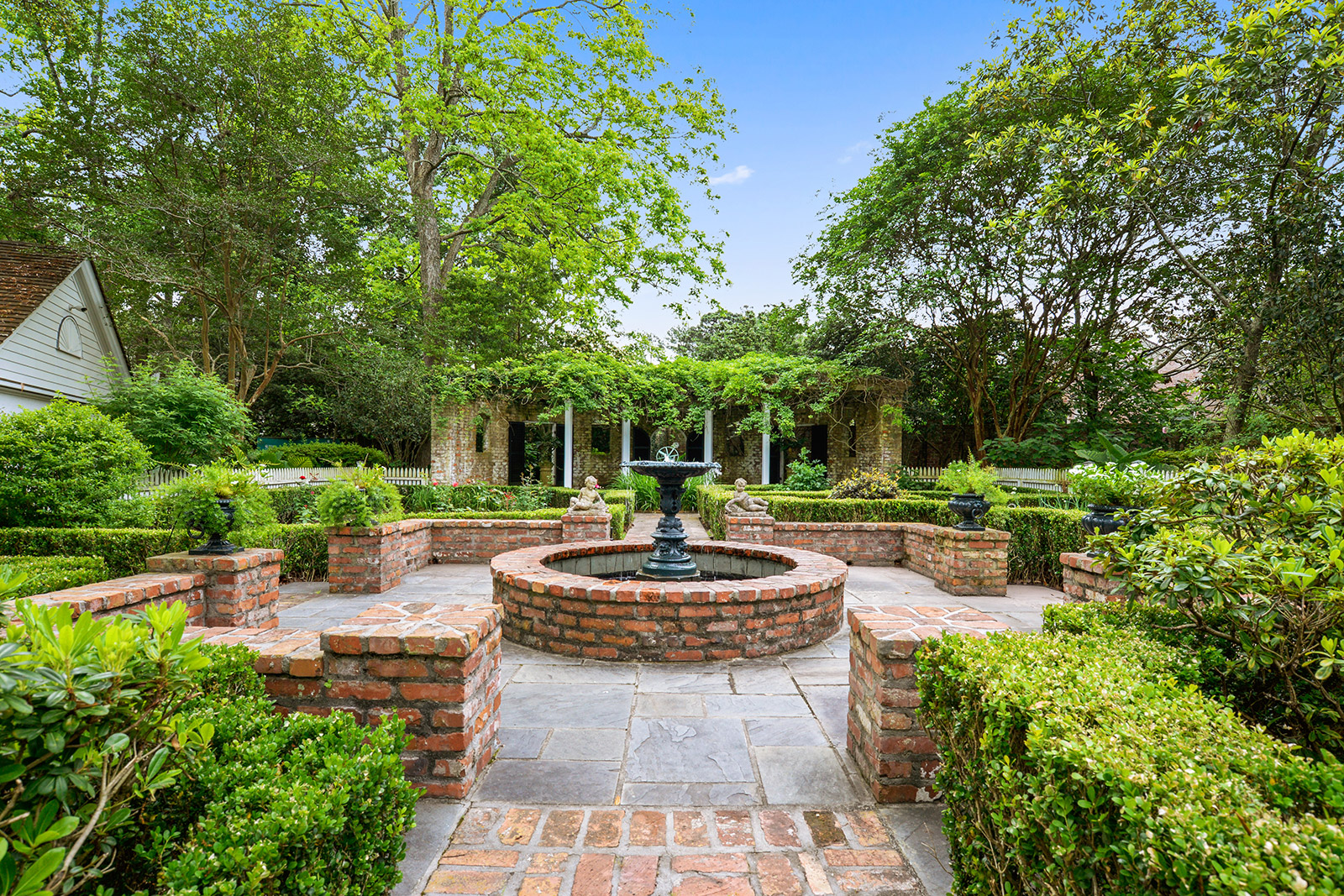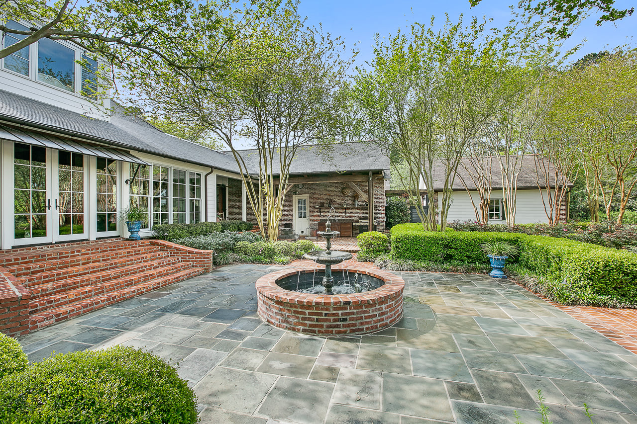 Lay of the Land: Large white columns and a hanging lantern offer a nod to the home’s stately beginnings. A large front lawn leads to sweeping views of the LSU Lakes. In the backyard, well-manicured gardens are complete with fountains, while a pool is accented by brick and vines.