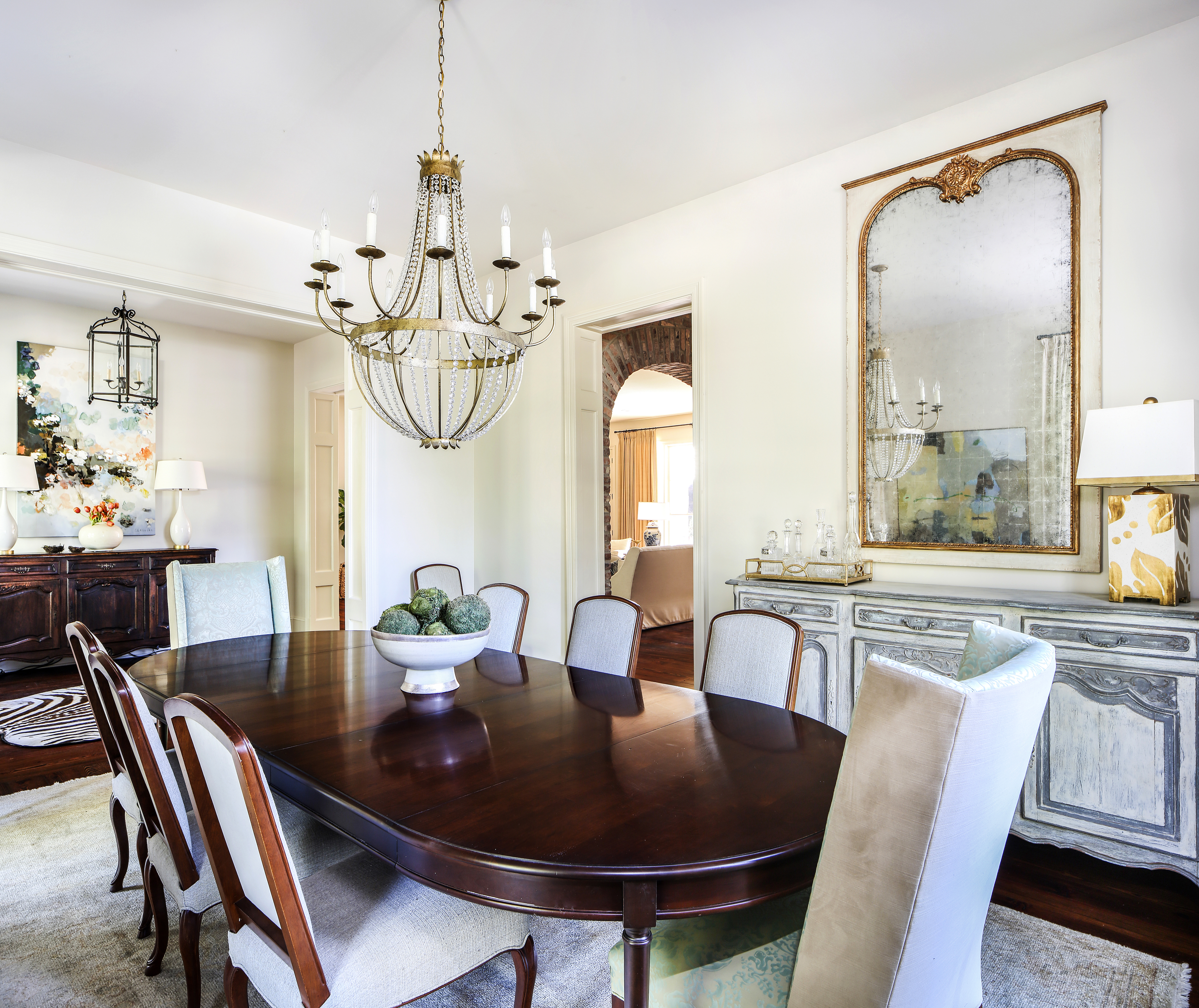 Back inside, the Uptons have relied on Anne McCanless to help them refresh their interior aesthetic, incorporating warm antiques and special pieces inherited from family members. “I’m a traditional person, but I have evolved,” says Mary. “I love more modern, abstract artwork and some other contemporary things, but still with that traditional feel. Anne has been here from the start and has helped our house evolve to what it is today. She helped us keep that traditional style while adding some edge to it with different pieces of art and lighting.”