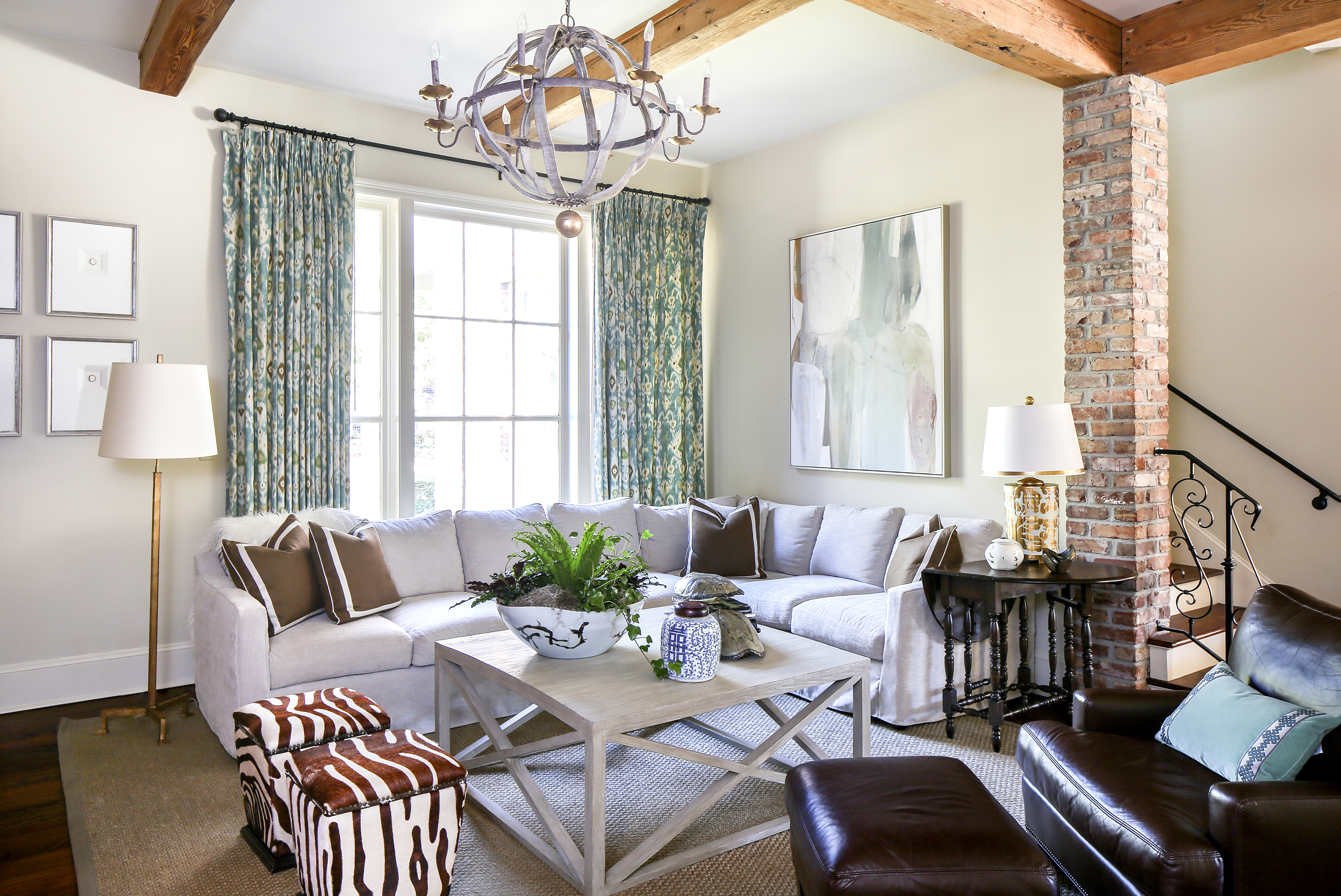 Mary Upton’s memories of growing up in a home designed by A. Hays Town inspired the ambiance of the renovated home she now shares with her husband Brent and their four children. This light-filled open living room contrasts Town-inspired brick arches with pale neutral seating pieces from Dixon Smith Interiors, a gray-toned Stark antelope carpet, and throw pillows from Texture and McMillin Interiors. Photos by Melissa Oivanki.