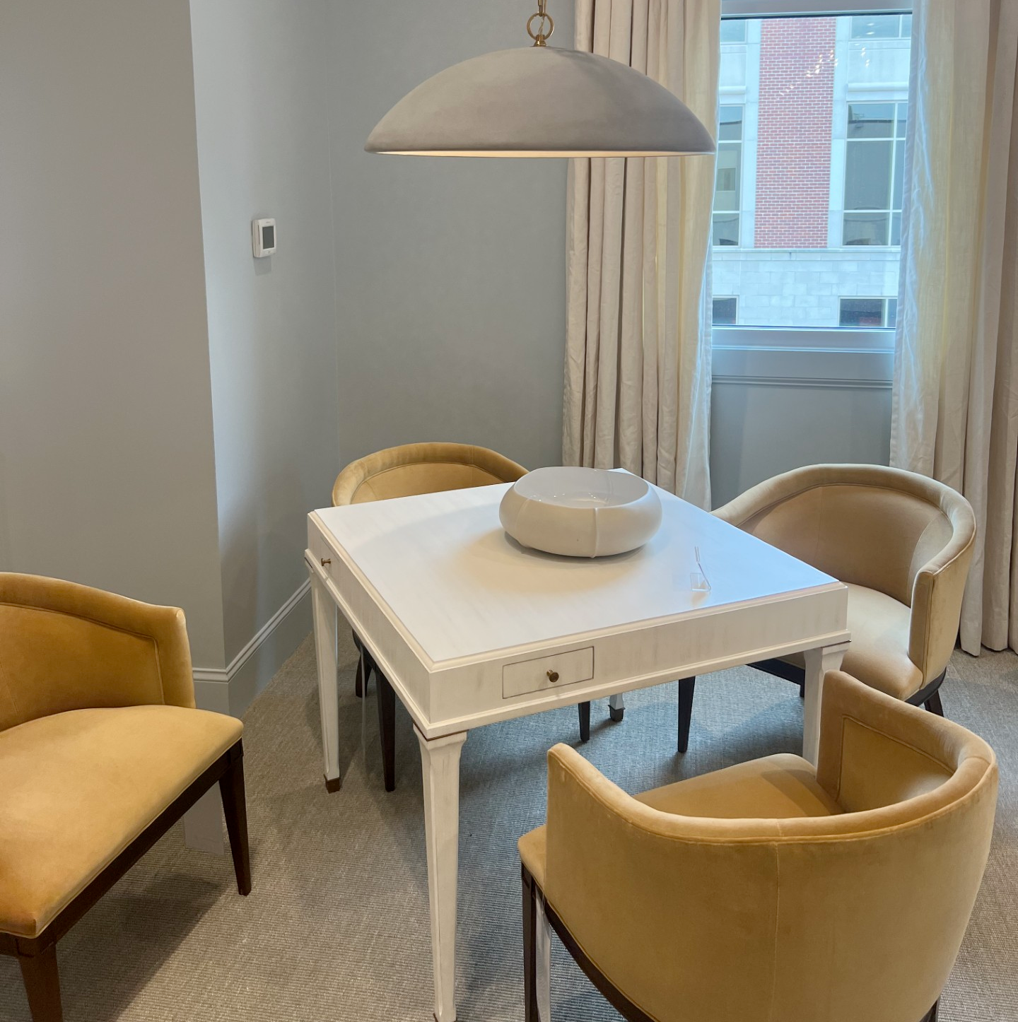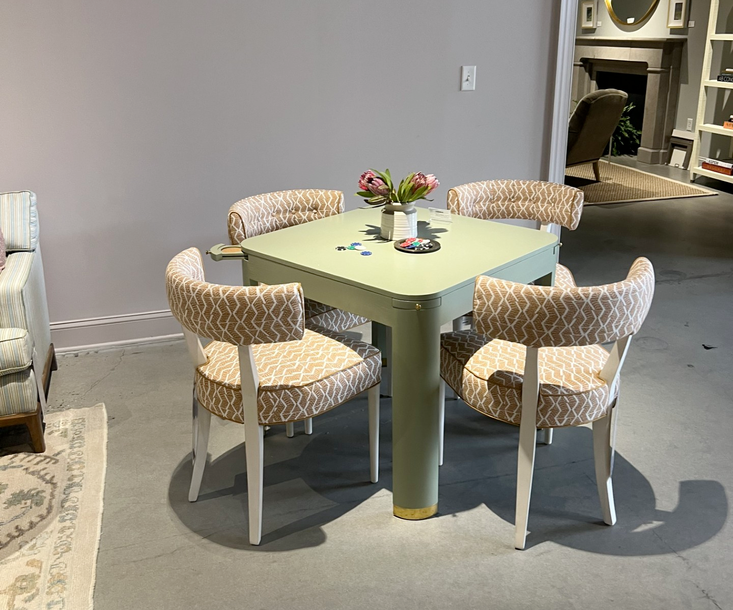 “Game tables are big right now. Most showrooms we visited had a game table set for 4 with fun but comfortable chairs. This idea of creating multi-use spaces is huge. We’re seeing a more creative use of space in all areas of the home. I love the idea of having multiple seating areas in a living space such as a banquette or desk area within a living room, but game tables are great because they can be used to play cards or the newly popular Mahjong, but can also be used for overflow seating at holidays.”