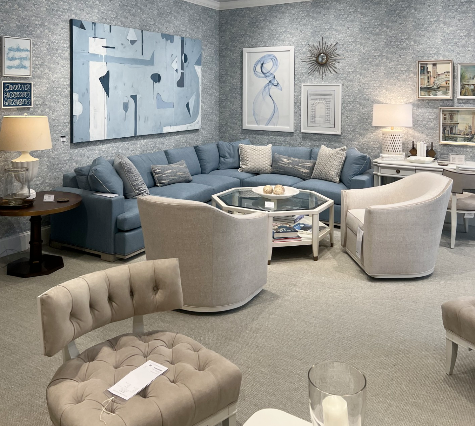“Another thing we loved was the creative use of color. We saw lots of pastel colors like pale pink, sage green, light blue and lavender. Blue has always been popular as it can really be a neutral, in my opinion, but I loved the look of layering different tones of the same color throughout a space. Thoughtful little details like piping and trim are great ways to bring in color if you want your space to read more neutral overall, but still want to incorporate some color. Pastels are a great option for people who want color, but don’t want to go bold. Pastel prints were also popular throughout different showrooms.”