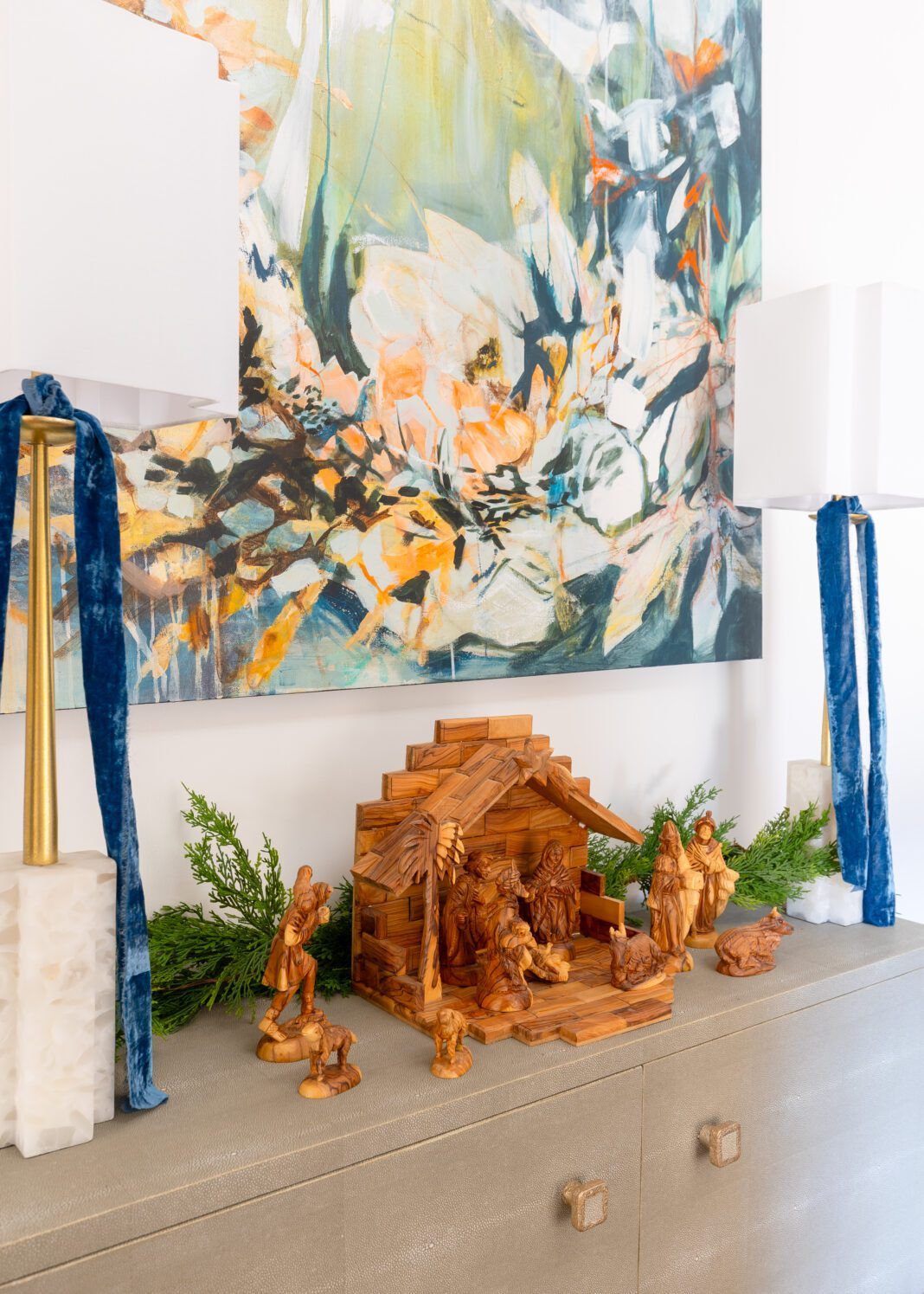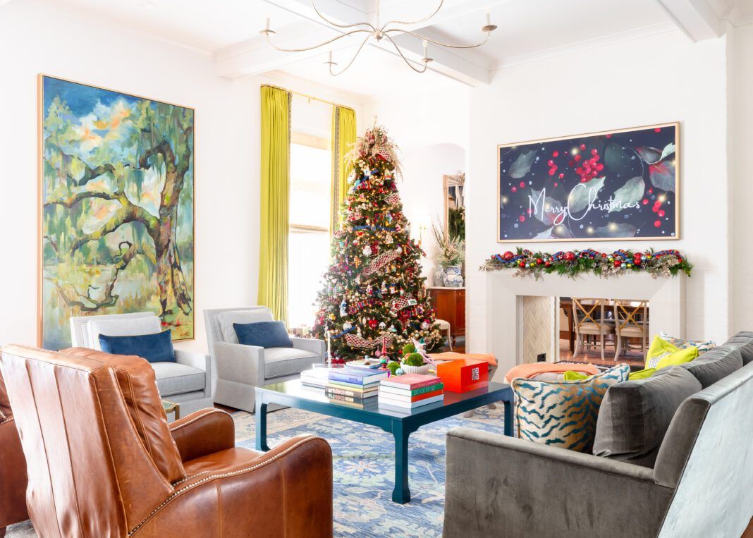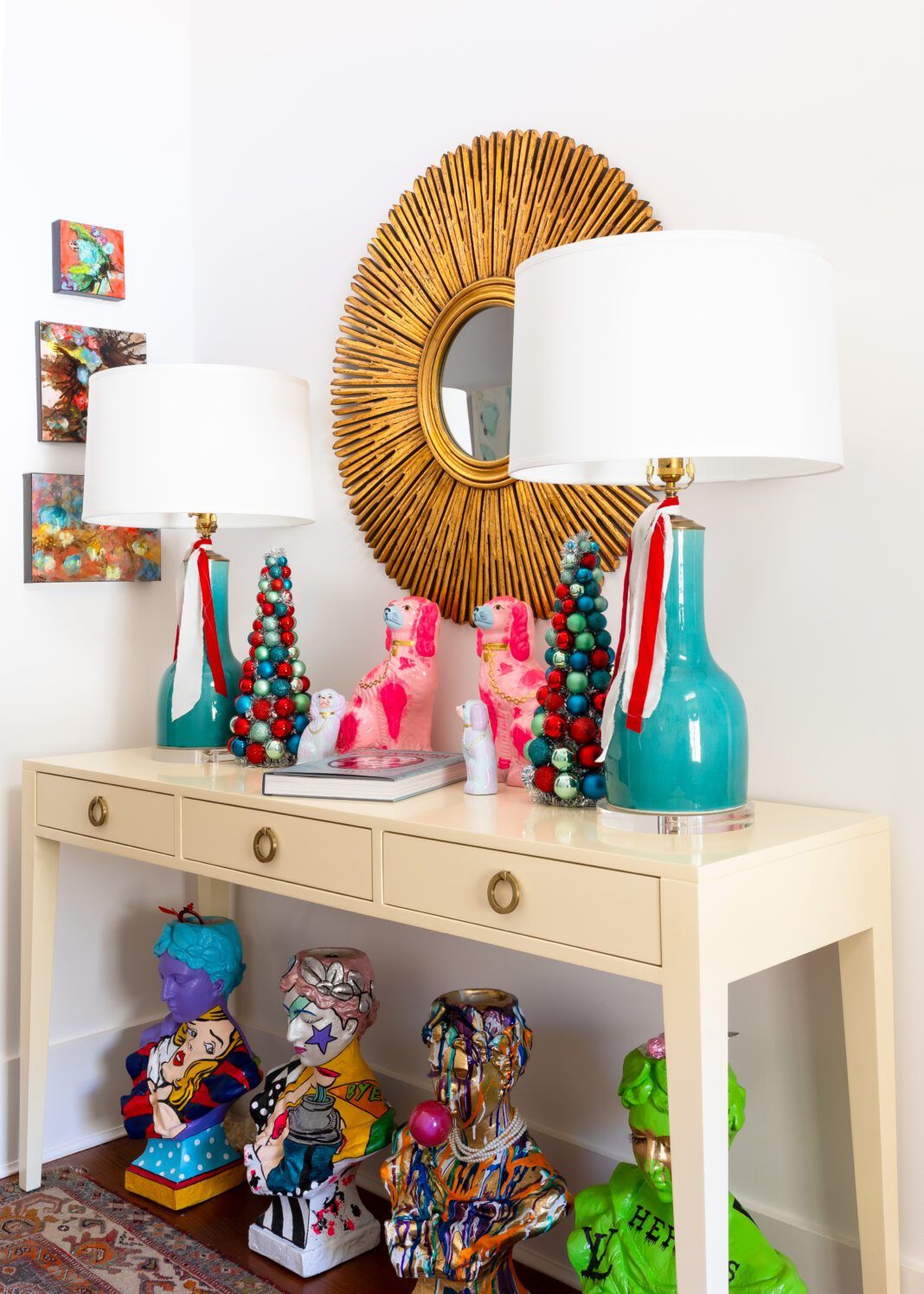 For the foyer, that vision ties back to the Longshore painting, its vivid colors inspiring the garlands, ribbons and ornaments. One tree is devoted entirely to Longshore’s annual ornament releases, which Katie has collected for years.