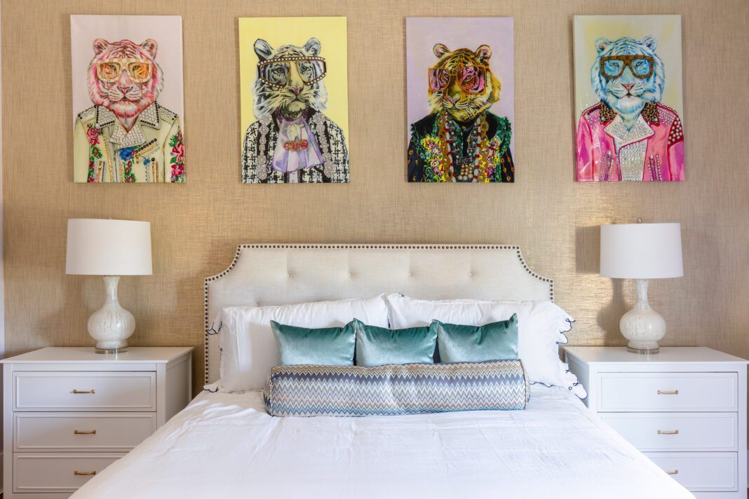 Among the Cheathams’ reasons for hiring Griffin was his respect for decorative items precious to them. Their décor has always honored family ties, and thanks to Steven’s family’s penchant for salvaging architectural gems, Griffin had plenty of design elements at his disposal. Of particular importance were a concrete medallion and an exterior sign saved from downtown’s old Paramount Theater before it was demolished. Griffin also understood the Cheathams’ love of bold colors and managed to seamlessly marry their heirlooms with vivid fabrics and artwork, such as the beloved Ashley Longshore painting in their foyer.