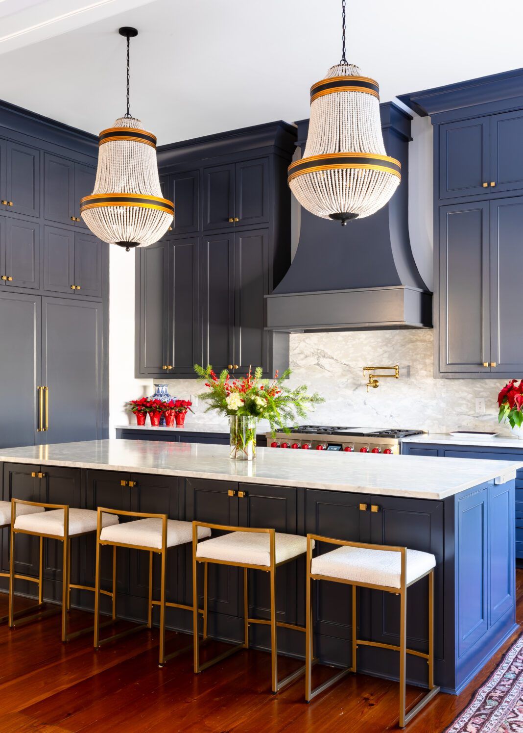 There was more for the Cheathams to consider while drafting house plans beyond aesthetic and Christmas décor—namely, the people who would enjoy it. As avid entertainers, they made sure each room had ample seating and space to move freely. The kitchen island seats five while leaving plenty of room for meal prep, giving it a chef’s table feel. The dining room can accommodate 10 dinner guests at the drop of a Santa hat, and the arrangement of the living room furniture gives it an almost conversation-pit quality, still leaving plenty of clearance for opening gifts under the tree and huddling in front of the fireplace.
