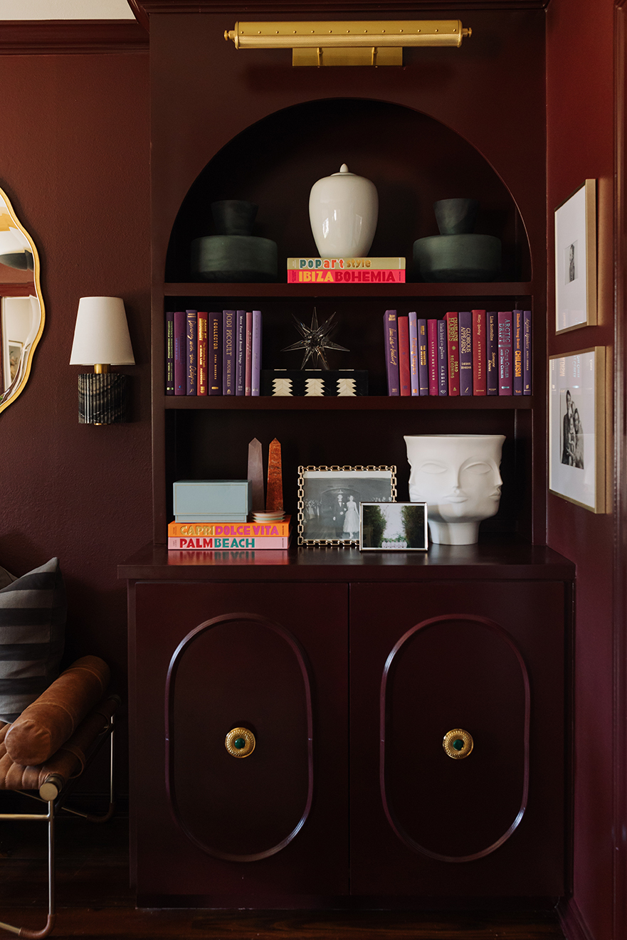 For example, in Bonnie’s office, which was formerly her daughters Anna and Mary’s playroom, the first thing to notice is the bold burgundy walls and trim. Beyond that, there’s the leather-covered desk, arched built-in bookcases and gold statement mirror. Looking even closer, the gilded pulls on the lower cabinetry are complete with turquoise embellishments and a collection of purple-toned books and curated family memories fill the above shelves.