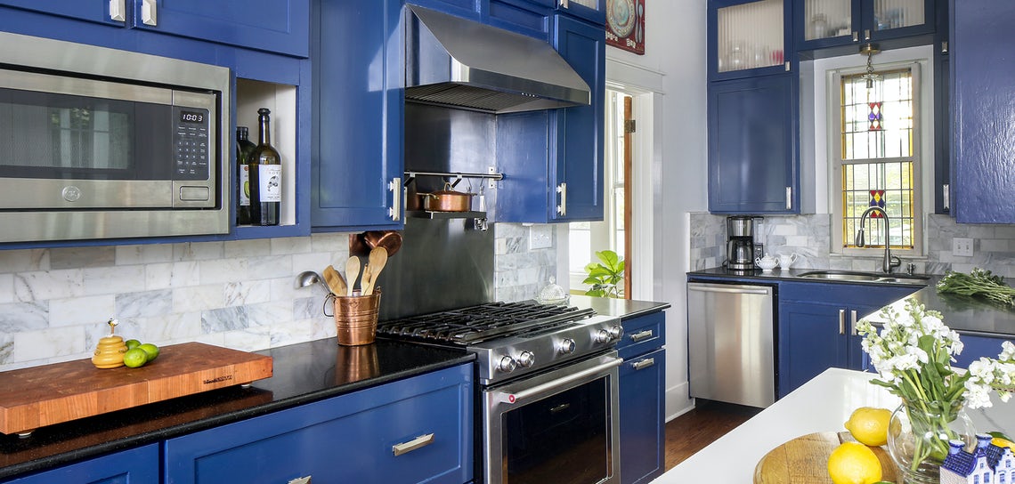 The bright blue cabinets are obviously the focus of this Mid City kitchen, but the simple stained glass window is the unsung hero. The yellow and red accents contrast the cabinets, adding even more interest to the small space. Design by Sara Brignac of Workshop 31 Twelve. Photo by Melissa Oivanki.