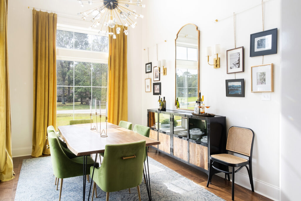 The large window in this midcentury-inspired dining room instantly brightens the space, even with darker accents. Adding a mirror also reflects more light throughout the room and into the rest of the house, making the space look larger and brighter. Design by Kristina Petit. Construction by AP Dodson Home Builders. Photo by Laura Steffan.