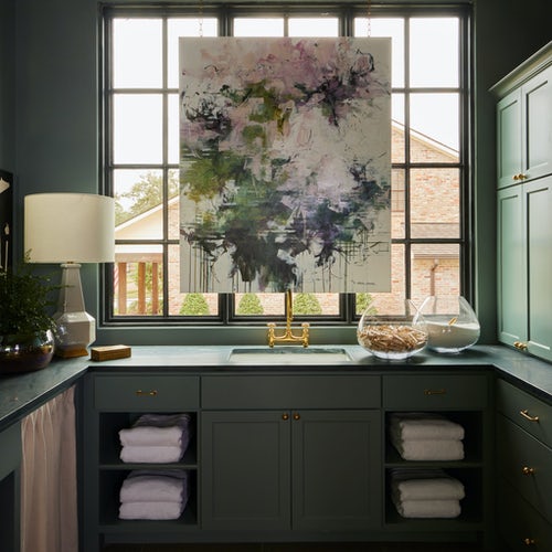 While the bold green paint might initially draw you into this laundry room designed for the 2021 Ivy House Designer Show Home, the art will make you stay. Designer Rachel Cannon incorporated a suspended Carlos Ramirez painting in front of the large, airy window, breaking up the pattern and softening the light. Architecture by Andy McDonald Design. Development and construction by Ivy Residential Concepts. Photo by Sara Essex Bradley.