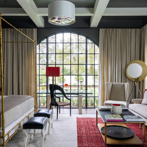 This grand window in Ty Larkin’s master bedroom in the 2021 Ivy House Designer Showhome does more than just bring light in—it acts as a bold statement piece for the rest of the room. Architecture by Andy McDonald Design. Development and construction by Ivy Residential Concepts. Photo by Sara Essex Bradley.